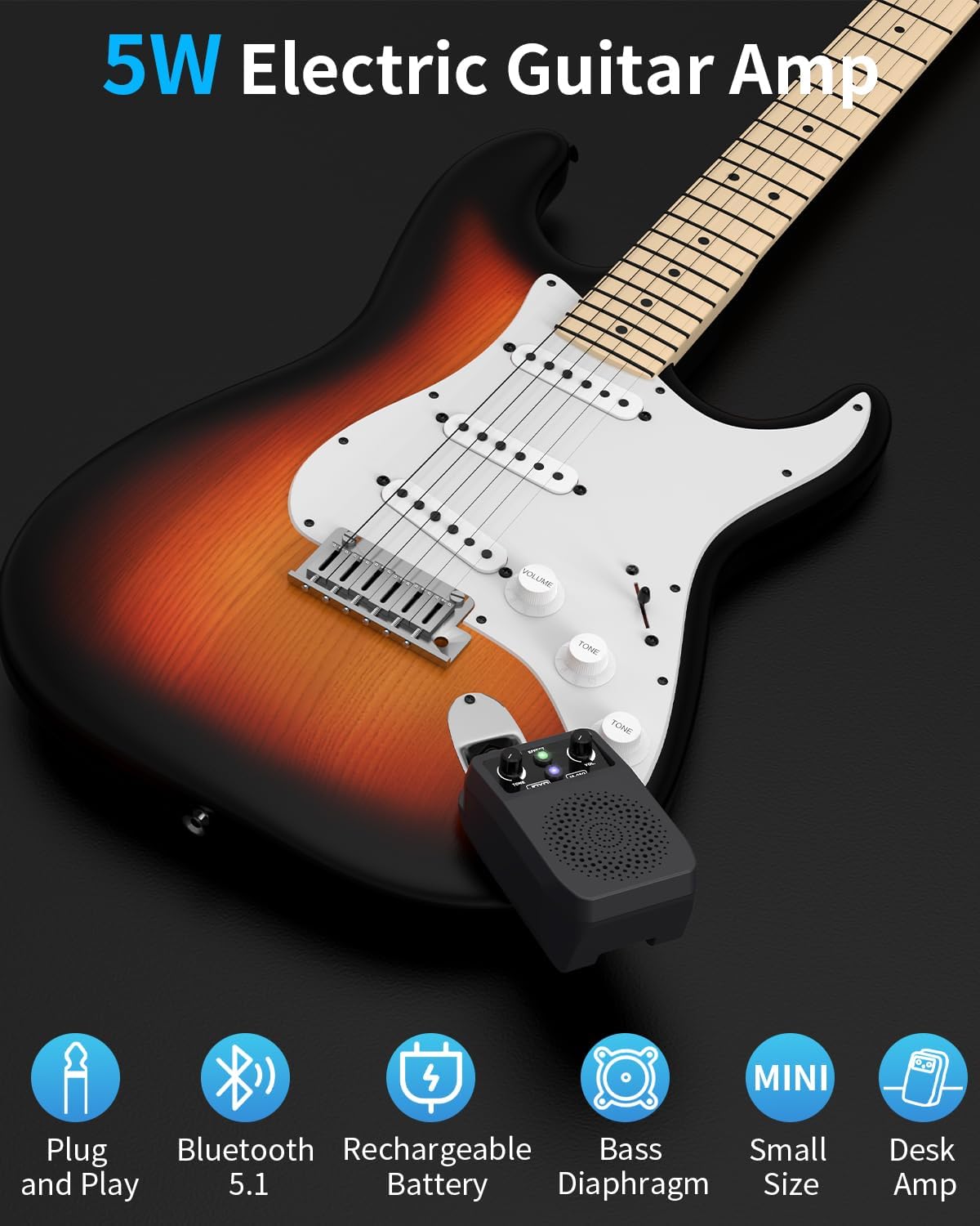The built-in rechargeable lithium battery provides up to 5 hours of continuous playtime on a single charge. The amp charges via a standard USB port, making it easy to power up using a wall adapter, power bank, or computer (5V/2A charger recommended for best results).