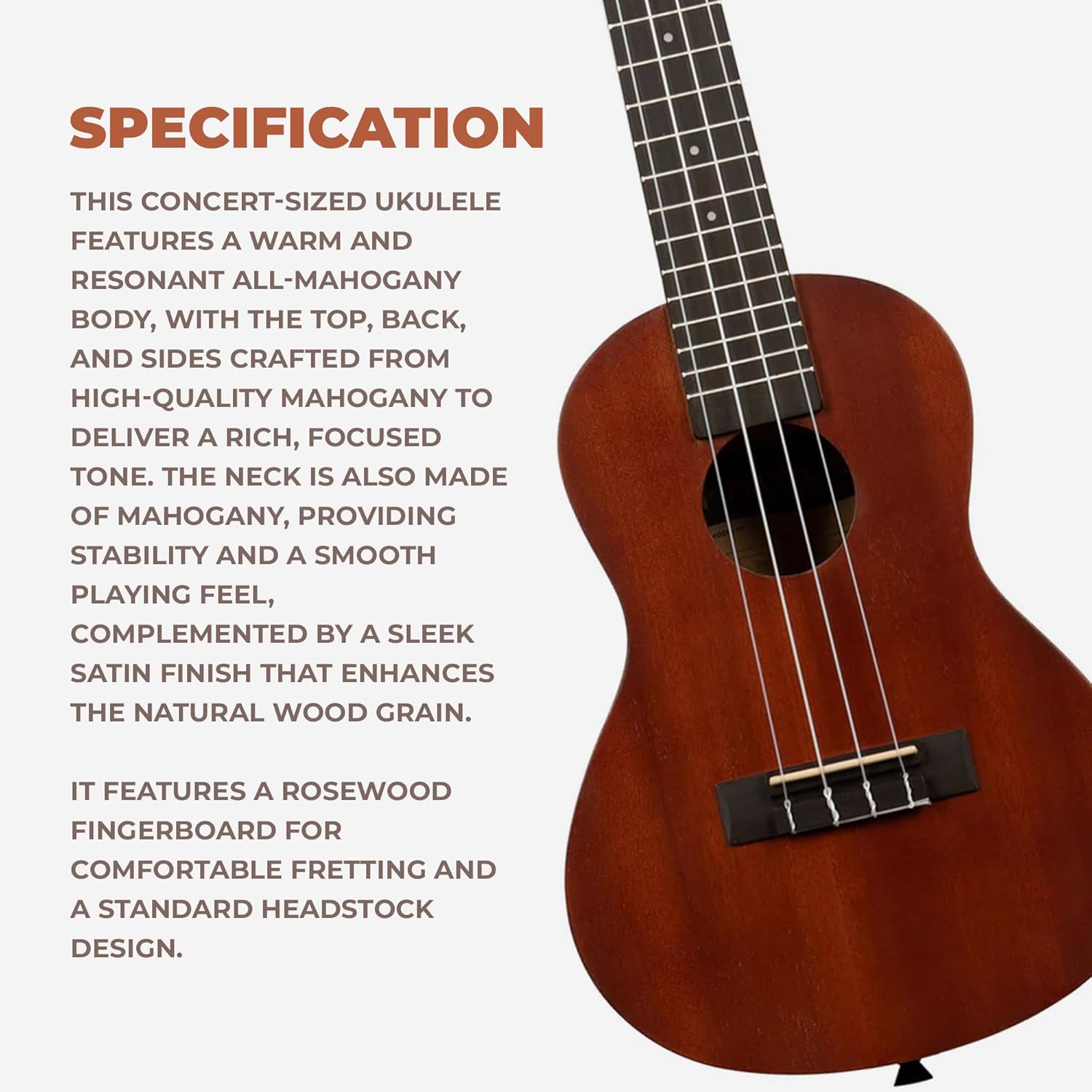 QUALITY CONSTRUCTION: Features a classic concert-sized body crafted from mahogany for a warm, resonant tone, paired with a durable walnut fingerboard and smooth satin finish that feels great in your hands.