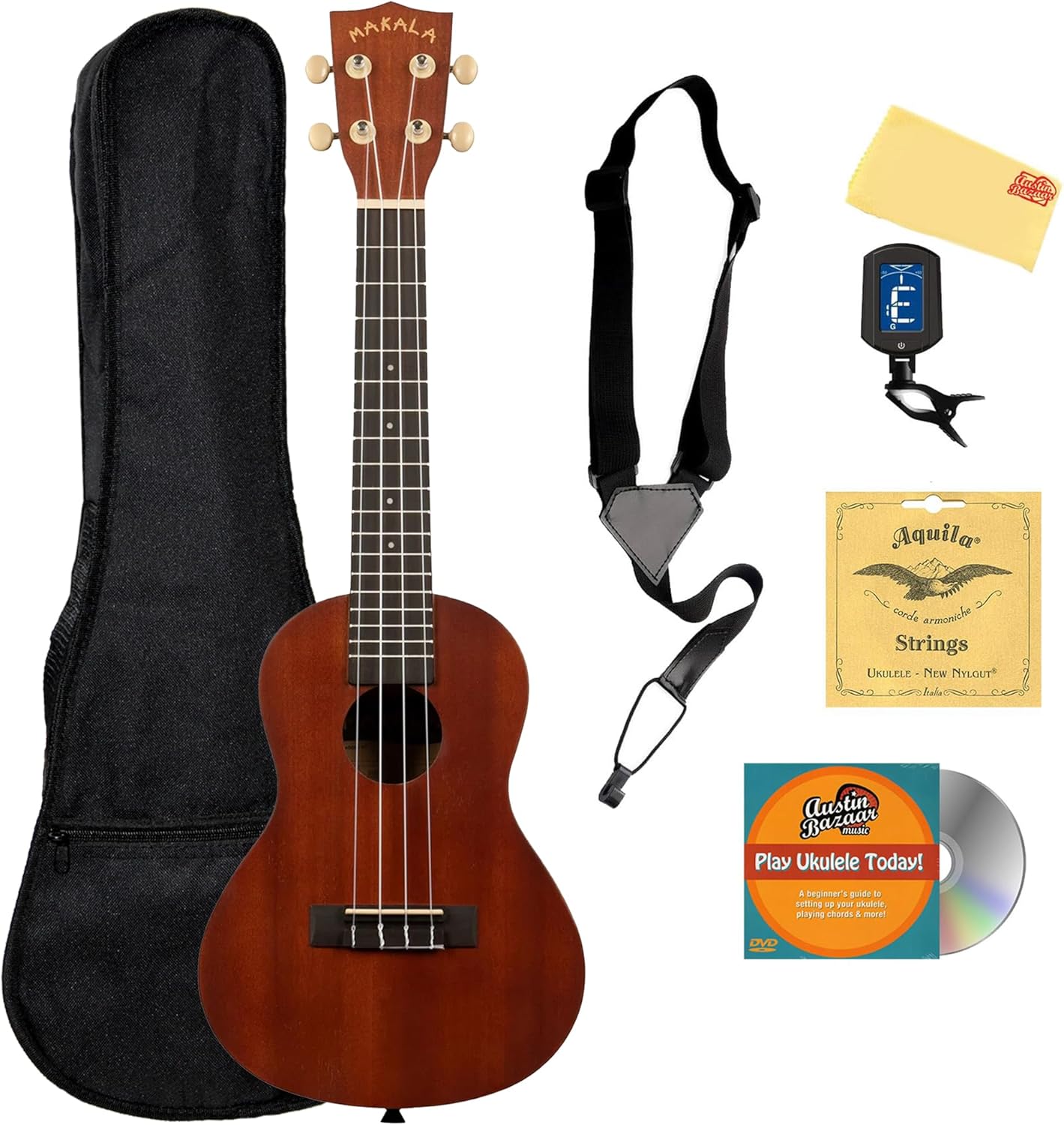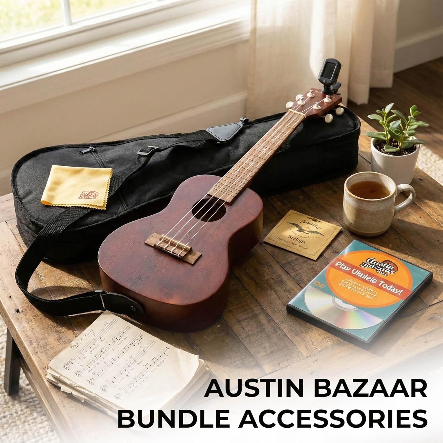 This exclusive Austin Bazaar bundle eliminates the guesswork of buying accessories. It comes complete with a protective padded gig bag to shield your ukulele from dings and scratches during transport. You will also receive a premium set of Aquila strings, the industry standard for ukulele tone, along with a polishing cloth to maintain your instrument’s luster. Additionally, the bundle includes a strap for added stability while standing, a clip-on tuner for quick and easy pitch adjustments, and an Austin Bazaar instructional DVD plus access to online lessons to guide you through your first chords and songs.