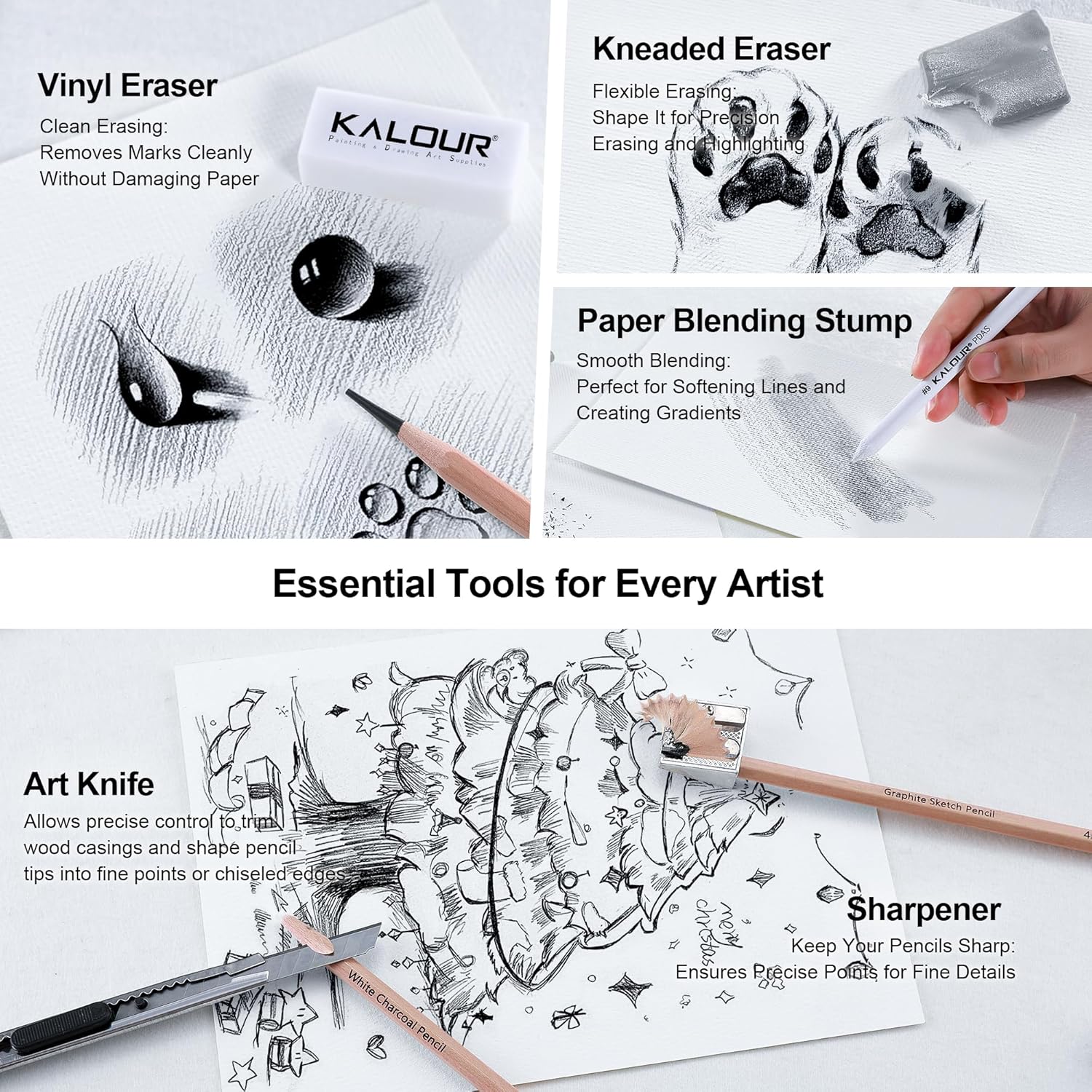 Elevate your artwork with the KALOUR 28 Pro Sketching Set, a comprehensive collection designed to meet the needs of aspiring artists and seasoned illustrators alike. This all-in-one studio toolkit provides the versatility required for sketching, shading, and intricate detailing across various media.