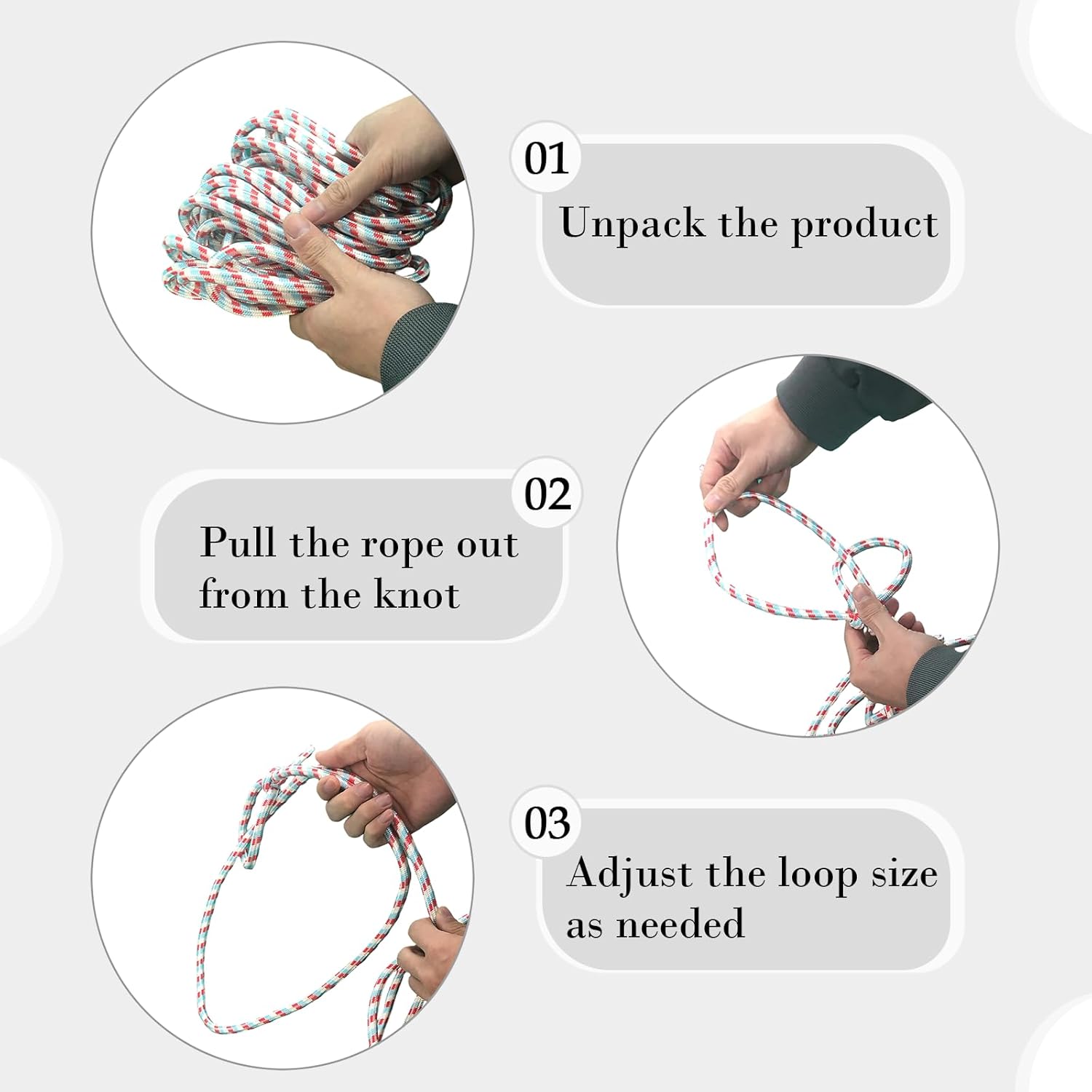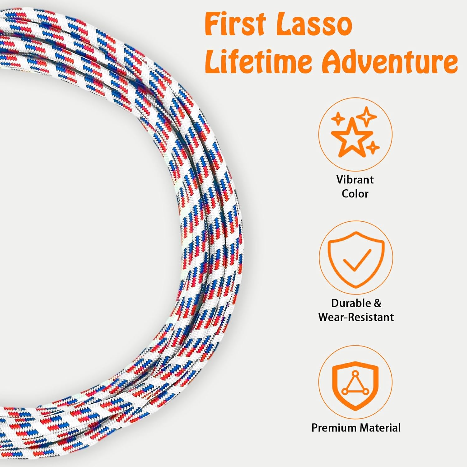 Give your little cowboy or cowgirl the ultimate western play experience with our premium kids lasso rope! Designed for aspiring rodeo stars, this 20-foot (6m) rope features a convenient pre-tied loop that makes lassoing fun and frustration-free from the very first throw. Crafted from durable yet soft polypropylene material, this 9mm lariat rope is perfectly weighted for young hands to swing, spin, and catch with confidence. Whether they’re practicing their roping skills in the backyard, completing their cowboy costume for Halloween or dress-up, or engaging in imaginative western-themed play, this rope delivers hours of active, screen-free entertainment. The ideal thickness and length provide excellent balance and control, helping children develop hand-eye coordination, focus, and gross motor skills while having a blast. Perfect birthday or holiday gift for any child who dreams of life on the range. Safe for indoor and outdoor play with adult supervision. Available in eye-catching red and blue color combination.