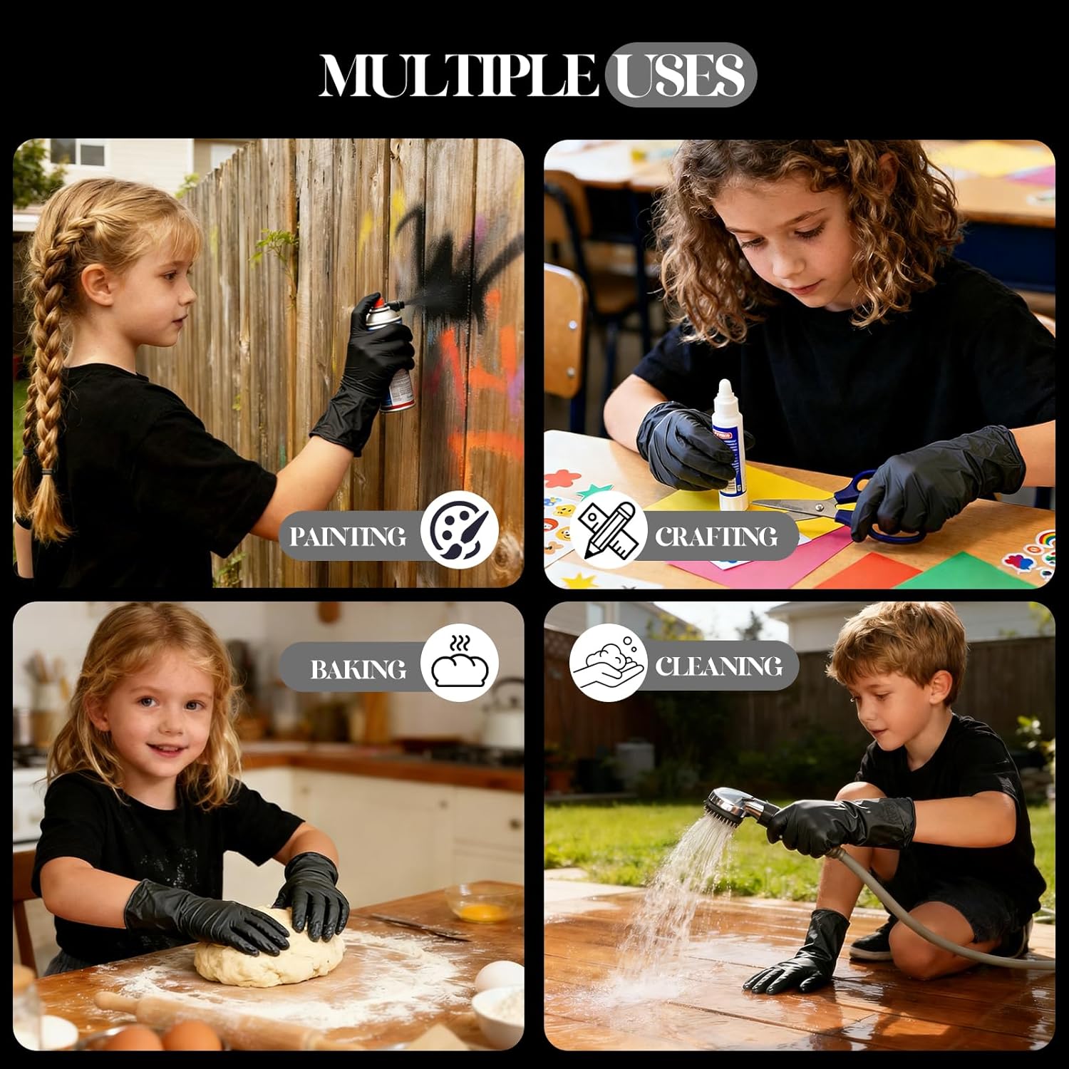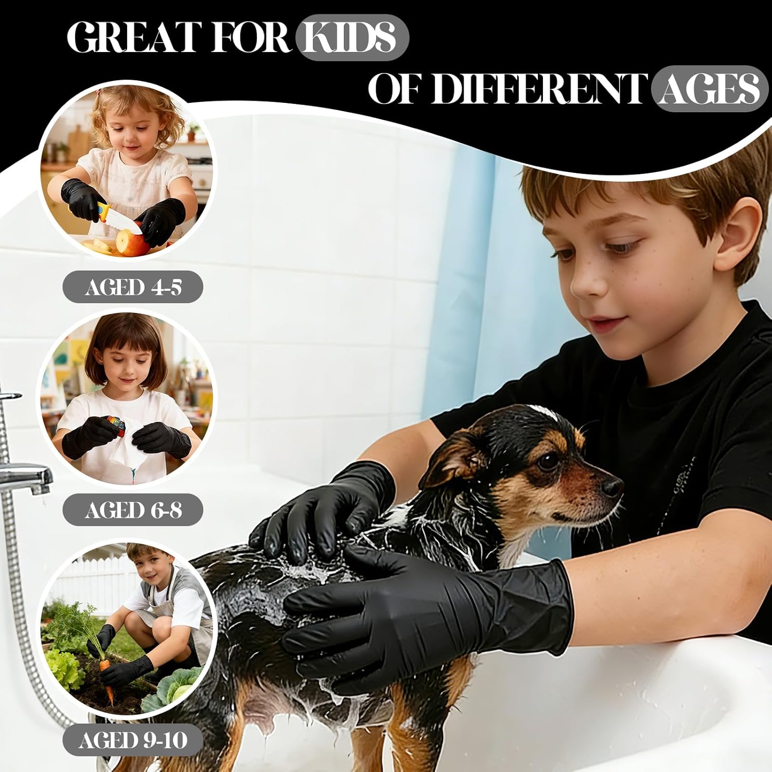 MAXIMUM COMFORT & SENSITIVITY: The flexible black nitrile material feels like a second skin, allowing kids to easily pick up small items, tie-dye shirts, or help with baking without losing tactile sensation. The fingertips feature a textured anti-slip surface for a secure grip on tools and utensils.