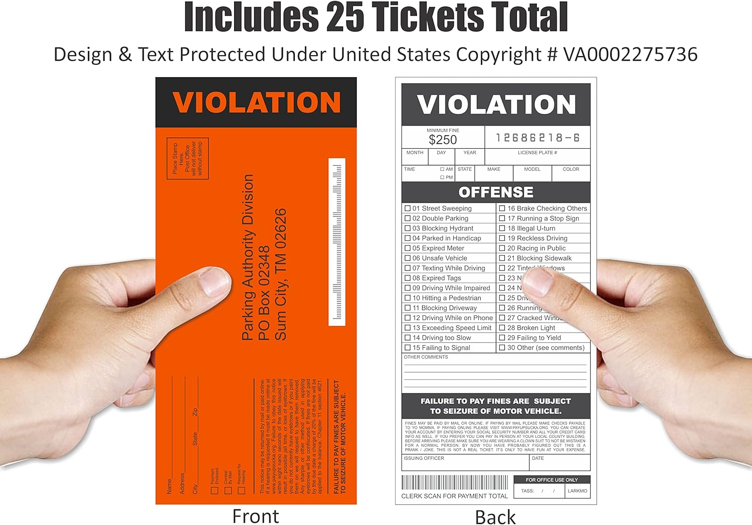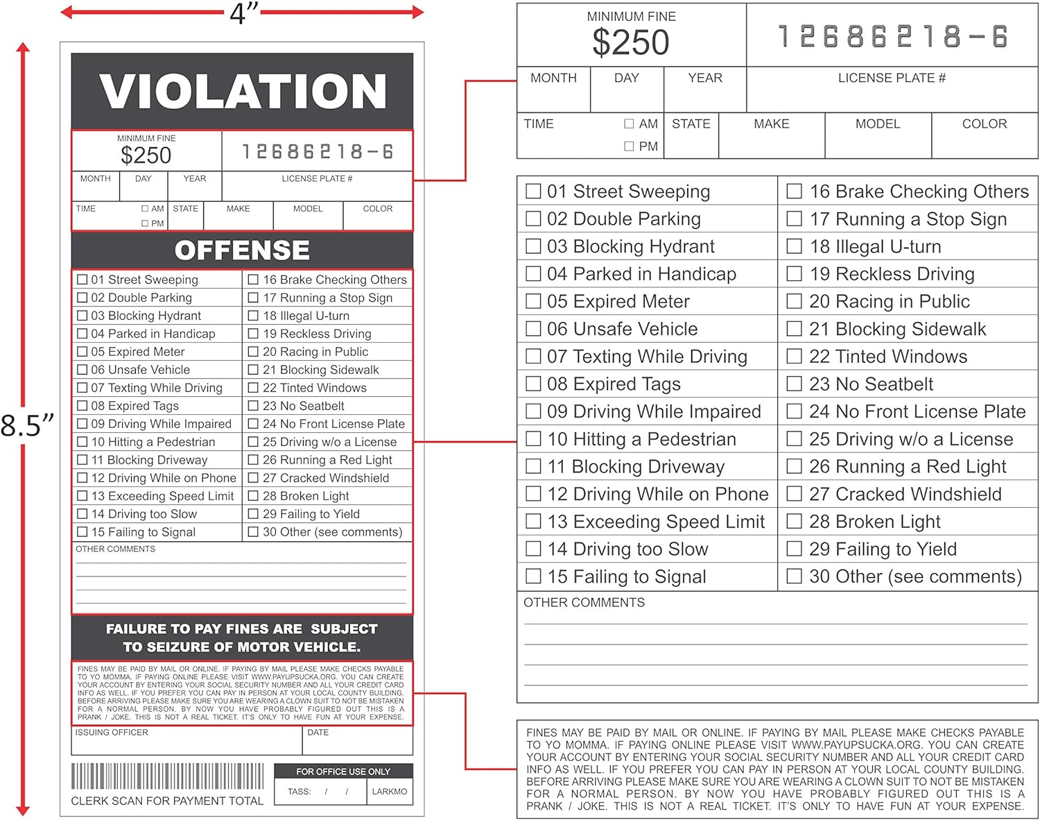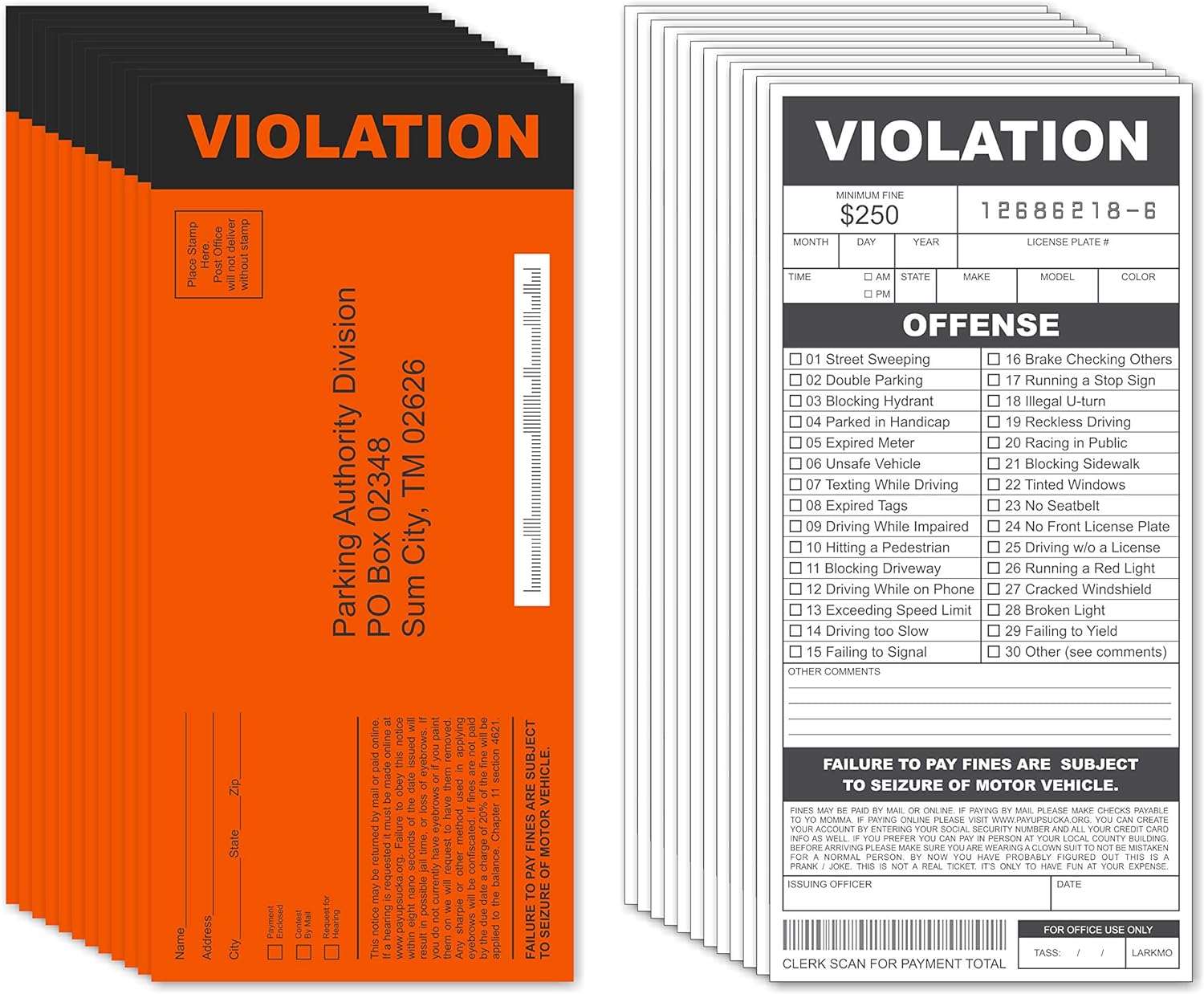 Tired of the same old boring pranks? Looking for a harmless yet hilarious way to mess with your friends, family, or coworkers? Your search is over! The Larkmo Fake Parking Tickets are the ultimate novelty gag gift for anyone with a sense of humor. This pack includes 25 high-quality, realistic-looking violation tickets designed to give the ‘recipient’ a moment of pure panic followed by laughter. These joke citations are perfect for April Fools’ Day, office pranks, stocking stuffers, or just a random Tuesday surprise. Unlike cheap imitations, our tickets feature crisp printing and authentic-looking formatting to sell the joke perfectly. They are kid-friendly and make for great party favors or props for aspiring ‘police officers’ at play. Simply fill out the violation, slip it under their windshield wiper or hand it to them directly, and watch the reaction! Please note: These are pretend tickets for novelty use only. While they look real, they will not result in any actual fines (unless your friends decide to prank you back). Add a cart today and get the party started!