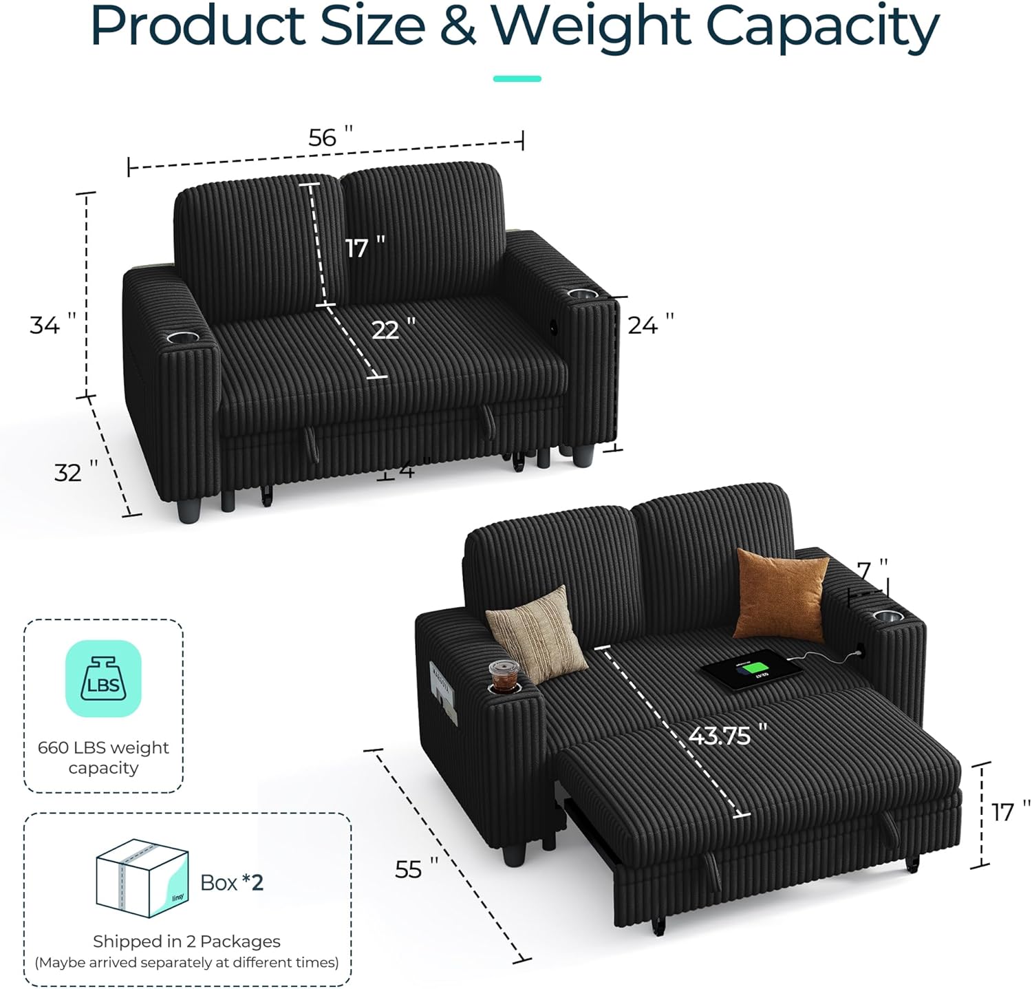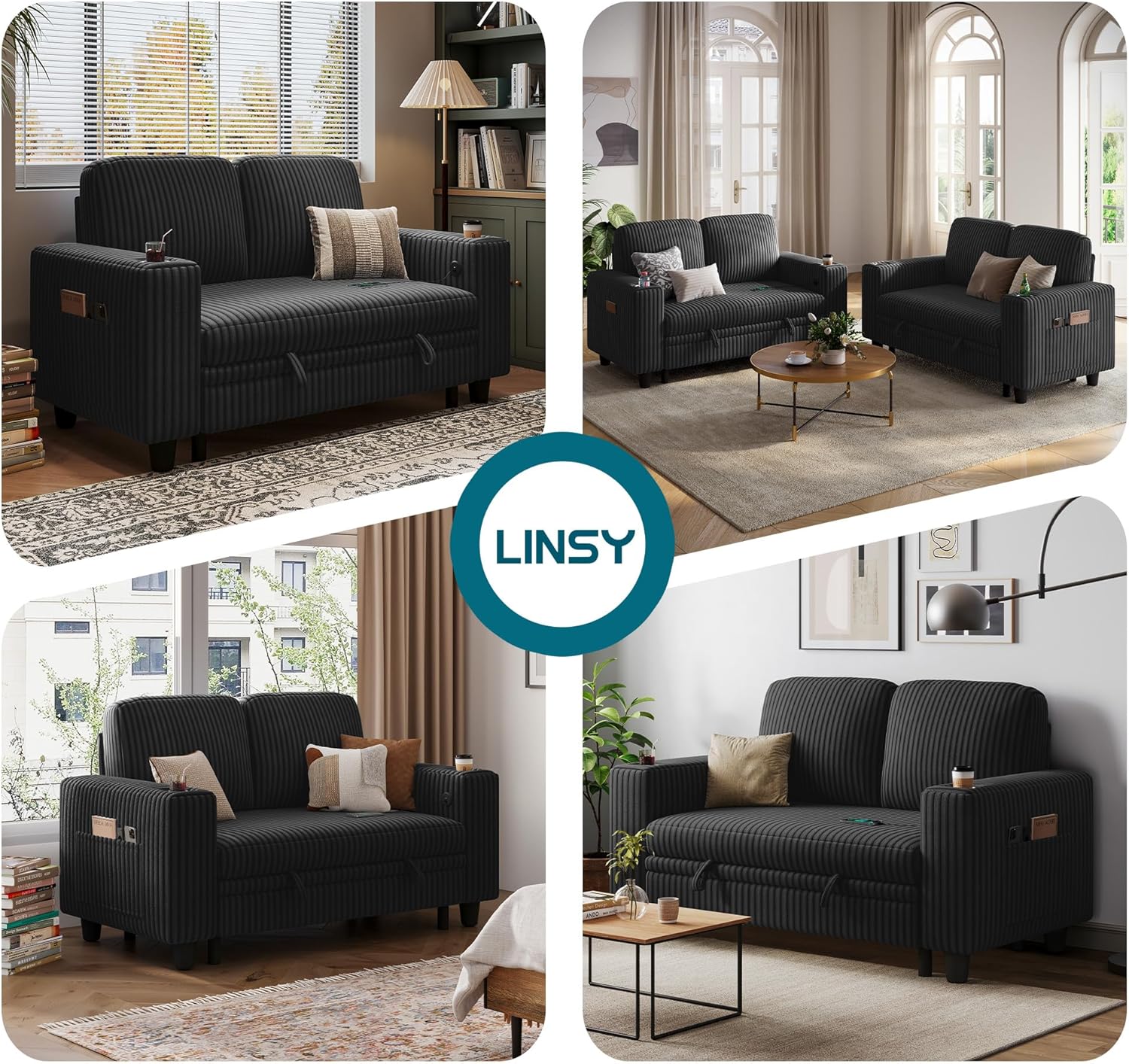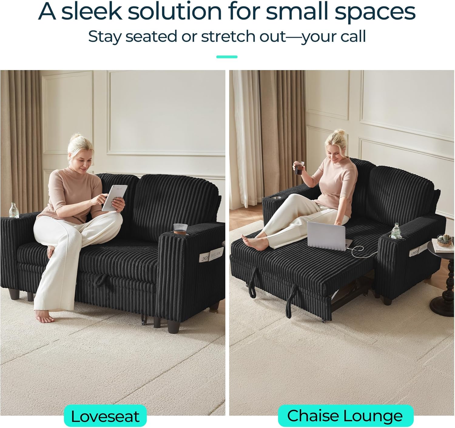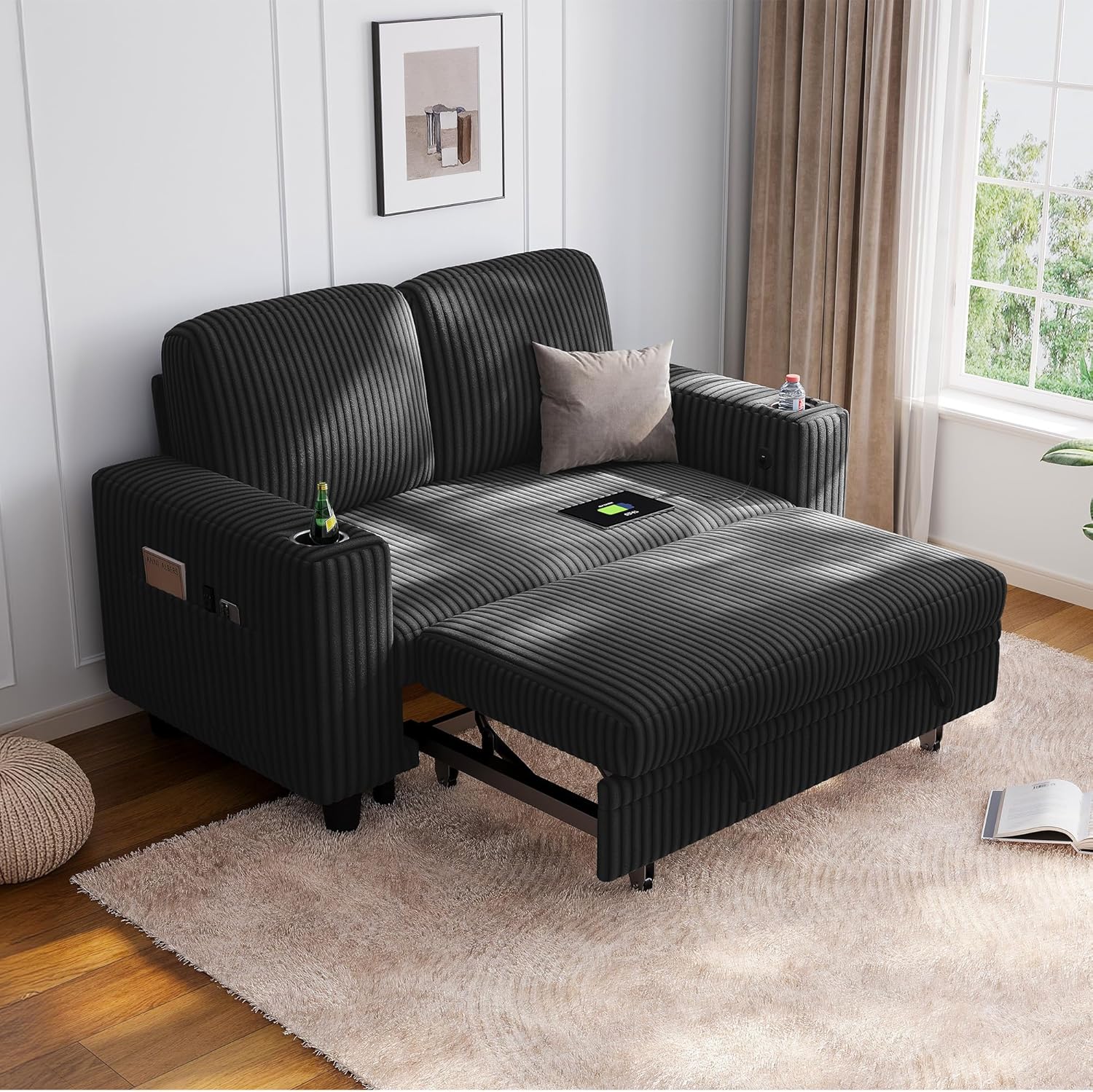 LINSY HOME 2-in-1 Convertible Loveseat Sofa Bed with Pull Out Chaise – 77.5” Wide Corduroy Sleeper Sofa with USB Charging, Cup Holders & Storage, Modern Furniture for Small Apartments (Black)