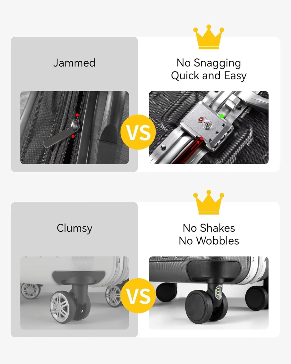 - Smooth Rolling Spinner Wheels: Navigate crowded terminals effortlessly. Our custom wheels feature built-in springs that minimize vibrations and absorb impact, ensuring a stable, smooth roll over any surface.
