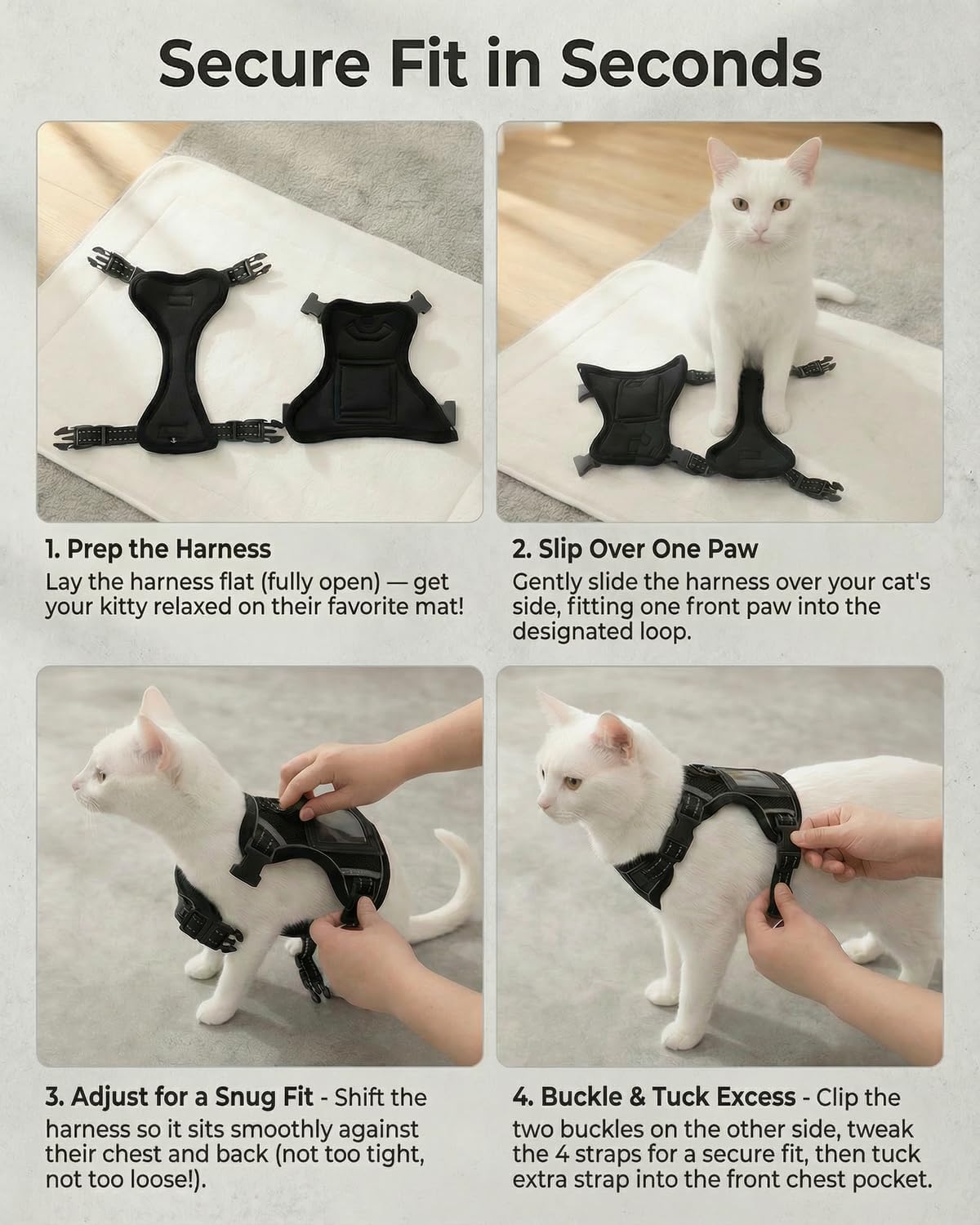 Experience worry-free outdoor adventures with your feline friend using the Luxelle Escape-Proof Cat Harness and Leash Set. Designed specifically for the unique anatomy of cats, this harness combines superior security with ultimate comfort. The innovative 4-way adjustable system ensures a custom, snug fit that prevents escape without restricting movement. Unlike standard harnesses, our design allows you to trim and tuck excess straps for a clean, professional finish.