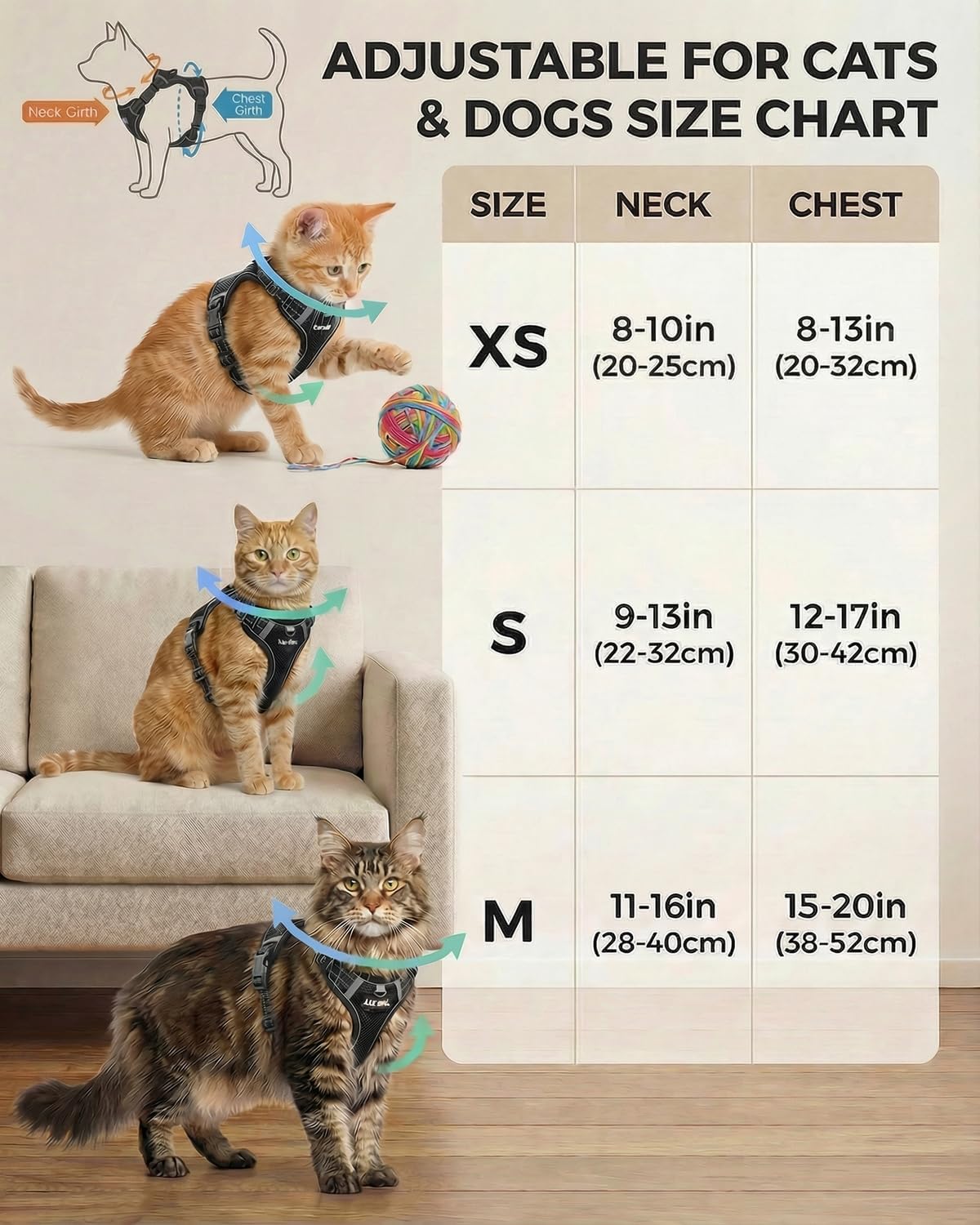 Safety is paramount during early morning or evening strolls. That’s why this vest features upgraded 360° reflective straps, ensuring your cat is visible from every angle in low-light conditions. The lightweight, breathable A+ mesh fabric guarantees maximum airflow, preventing overheating and skin irritation, while the ergonomic neckline eliminates choking hazards and reduces neck pressure for a pleasant walking experience.