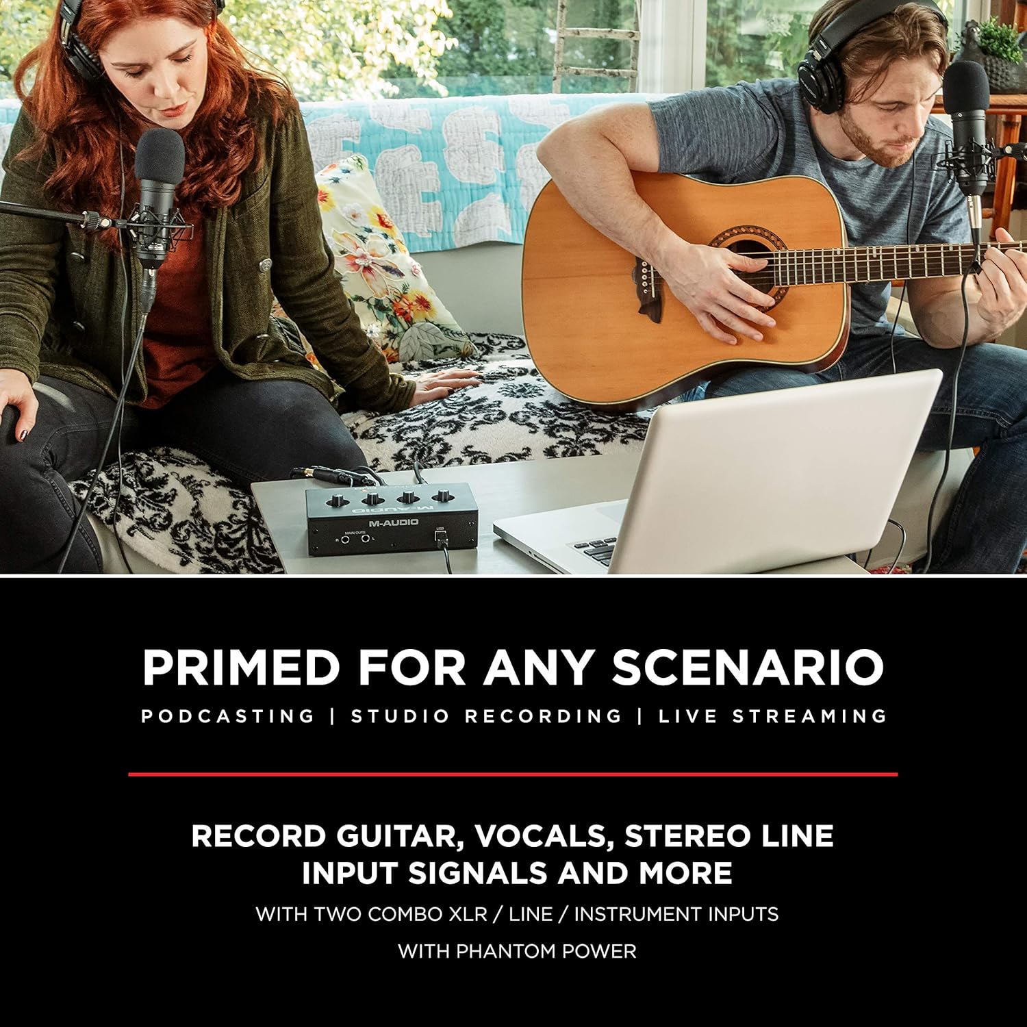 The M-Track Duo features two combo Crystal Preamps with phantom power, ensuring detailed and transparent recordings from any microphone, including high-end condenser mics. The flexible input design accommodates any source: