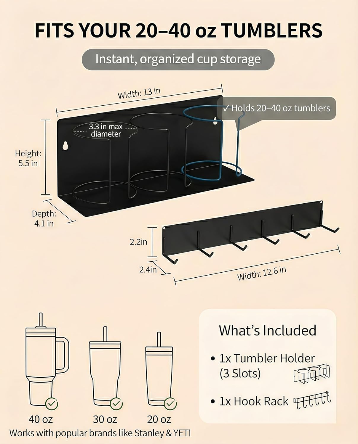 - Compatibility: Fits tumblers 20oz–40oz (Handles up to 1.2″ wide)