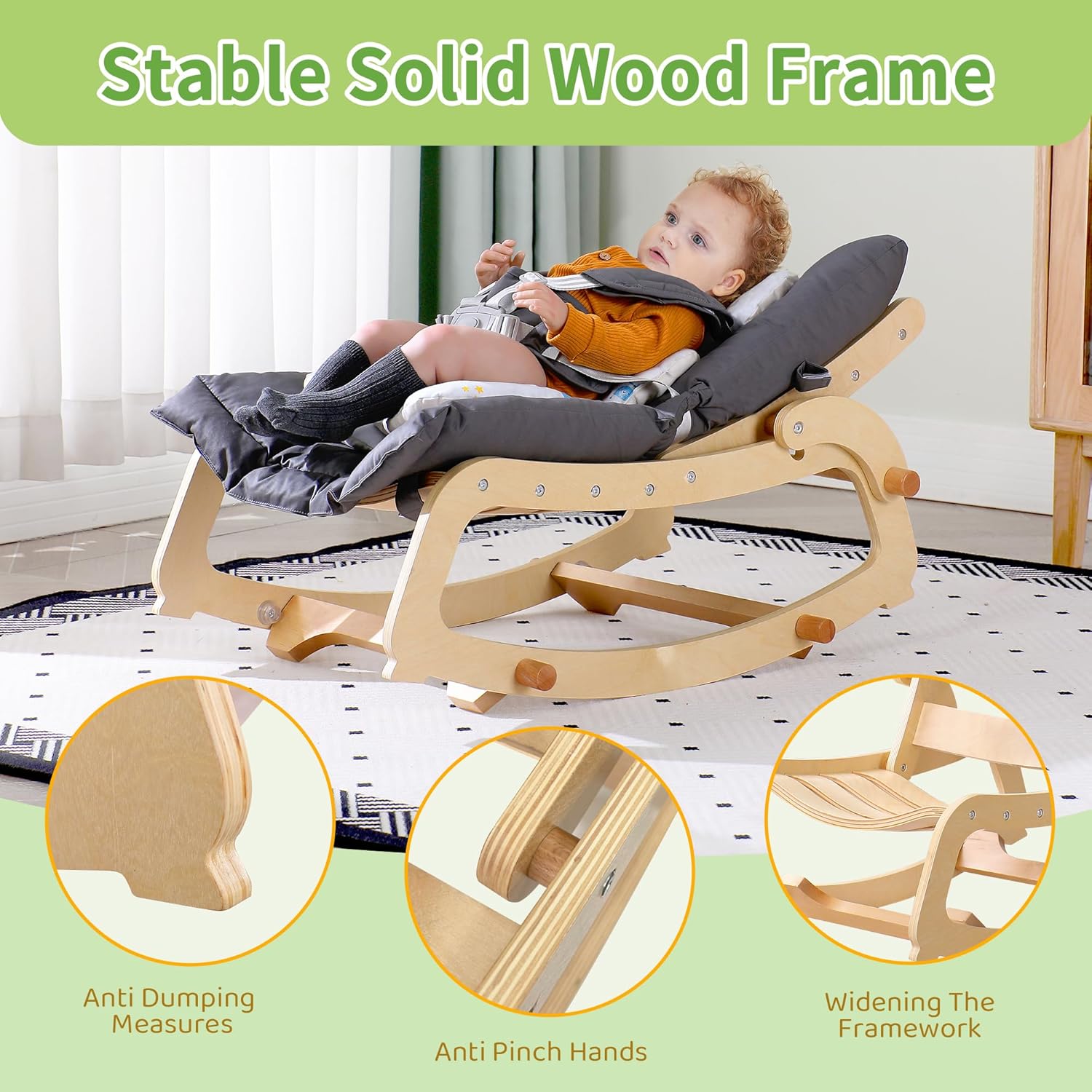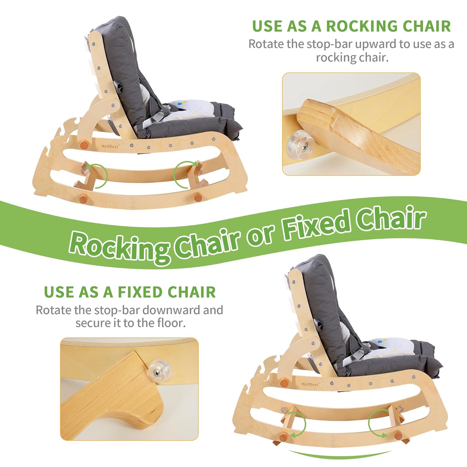 MallBest 3-in-1 Wooden Baby Rocker Chair with Double Cushions – Adjustable Infant to Toddler Rocking Seat with 5-Point Harness, Modern Grey Nursery Furniture