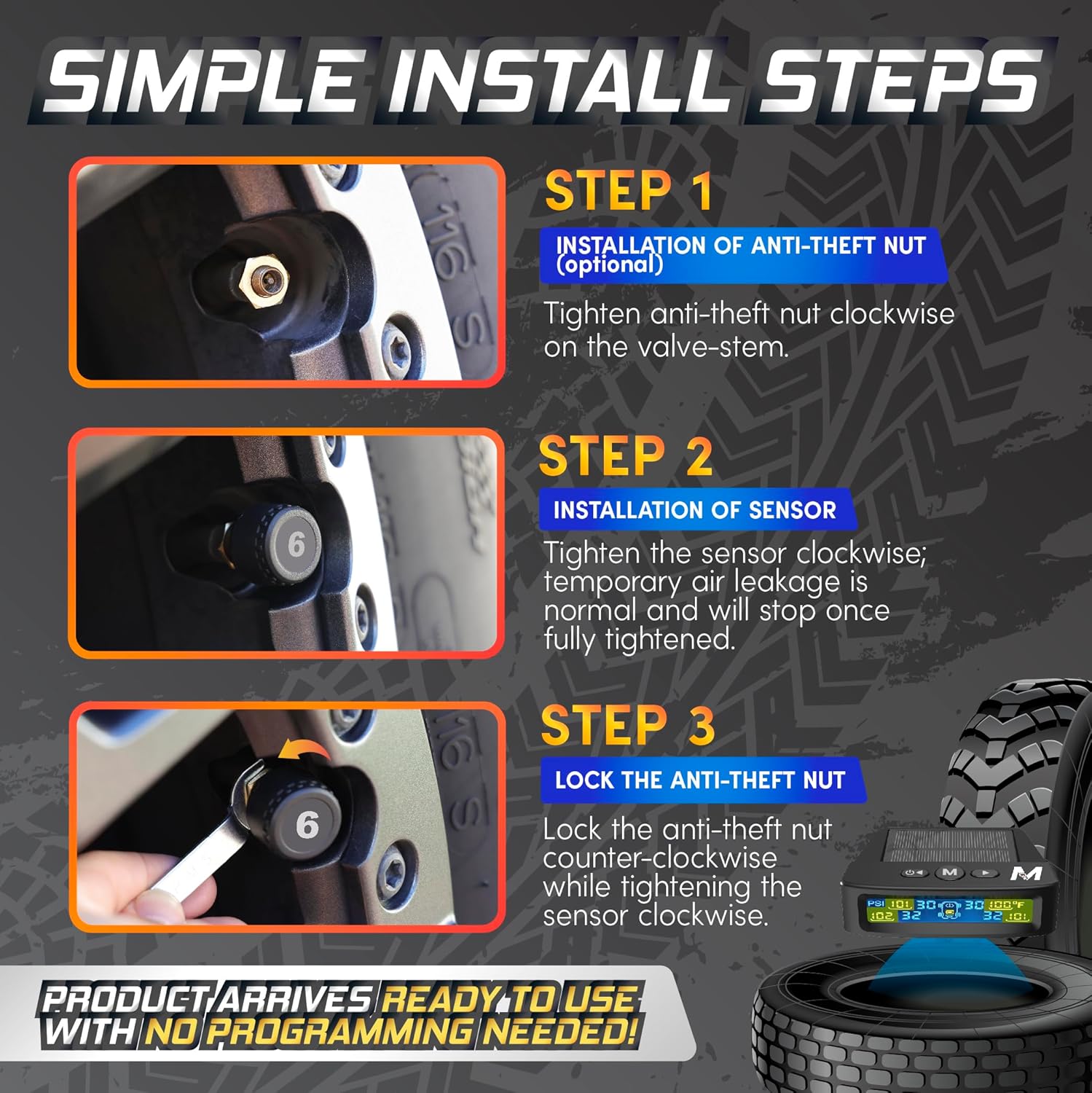 Real-Time Data & Accuracy: The bright LCD screen updates every second while driving, displaying live pressure and temperature readings to keep you informed of sudden changes. Each sensor is IP67 waterproof, ensuring reliable performance in rain or shine.
