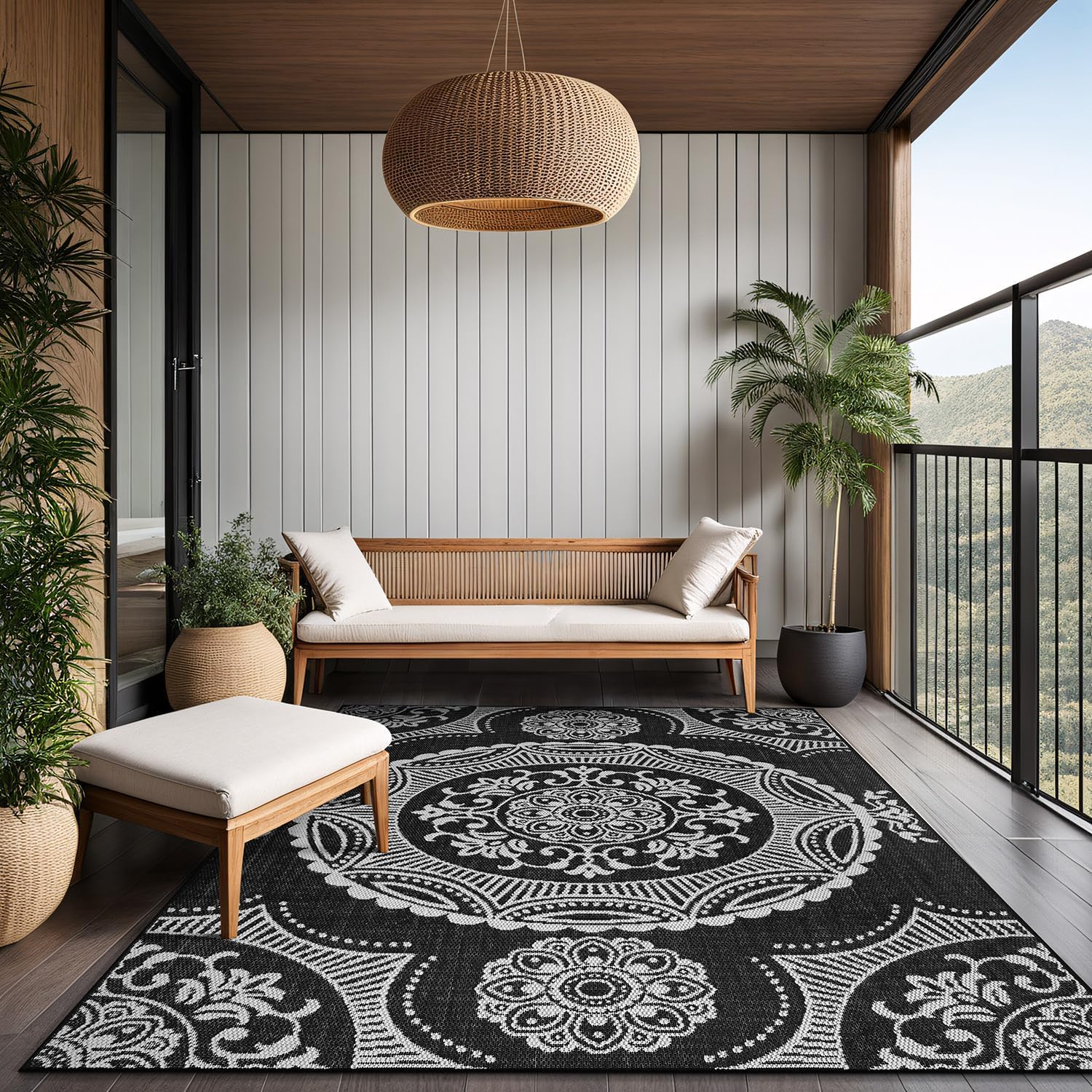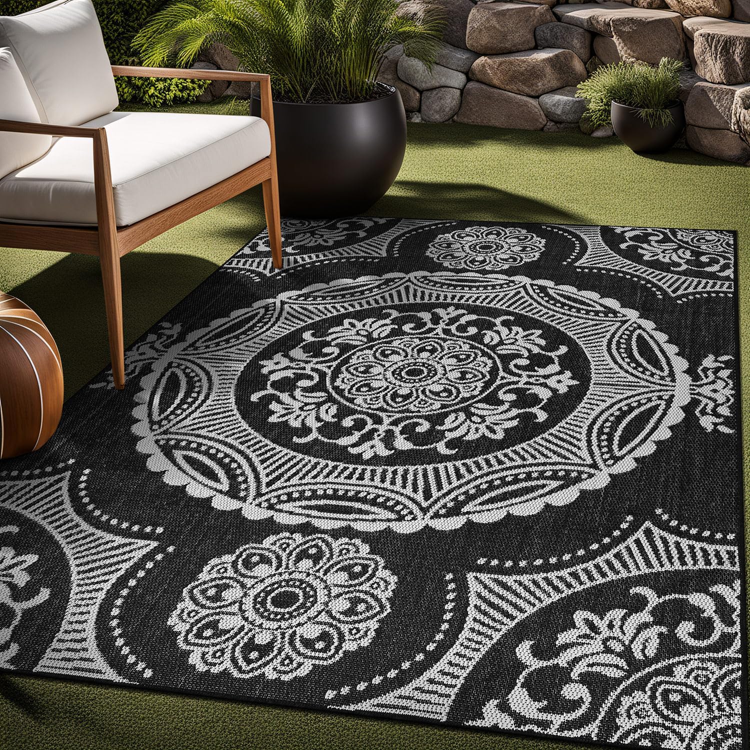 Crafted for busy households, this rug is 100% waterproof and features a low-pile construction that is stain-resistant and incredibly easy to clean—simply hose it down or wipe away spills. The high-quality material ensures it is non-shedding, maintaining a neat appearance in high-traffic areas like entryways, kitchens, and living rooms. Its classic black medallion pattern provides a versatile aesthetic that complements both contemporary and traditional decor styles.