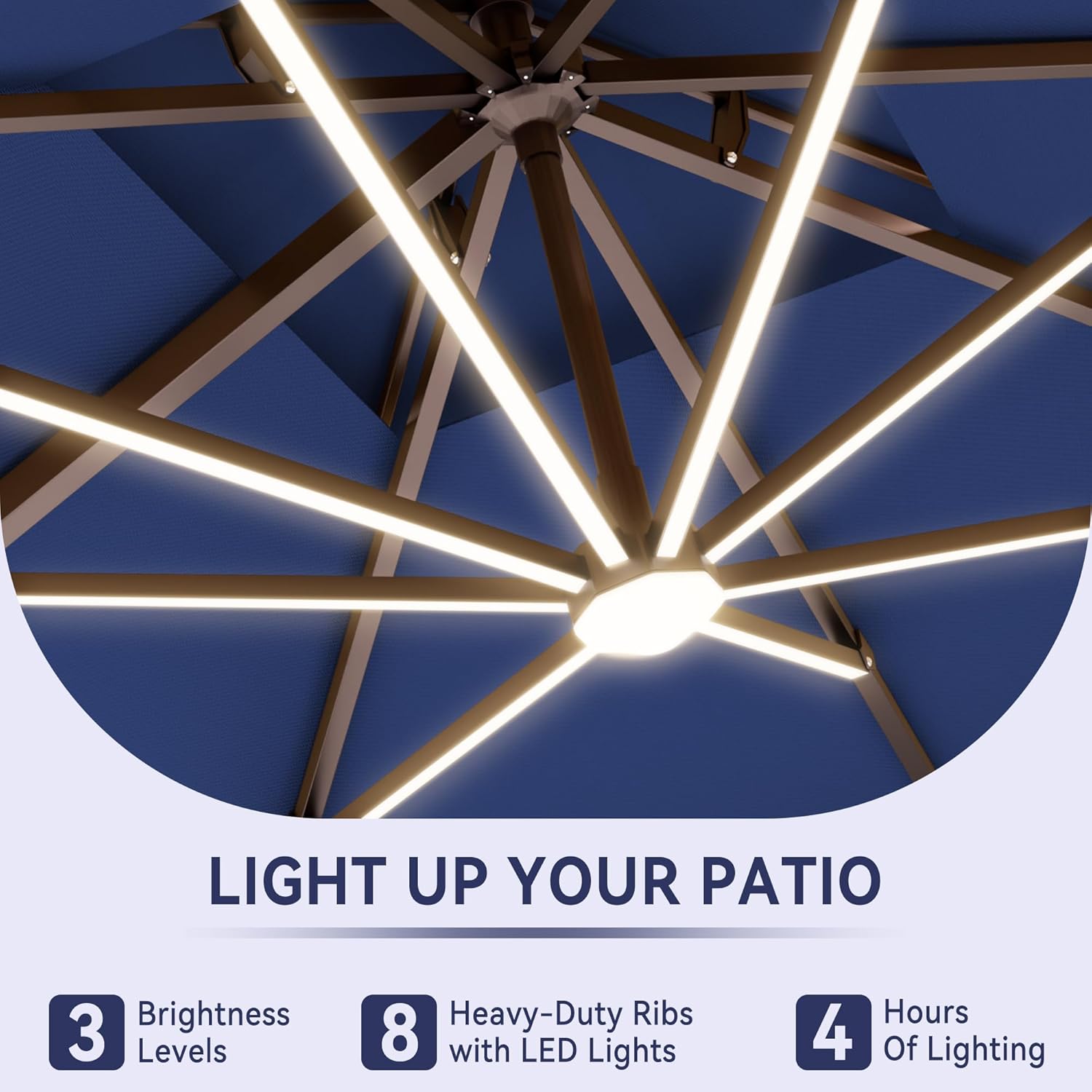 - Integrated Solar LED Lighting: Equipped with 8 LED ribs powered by a solar panel, this umbrella provides up to 4 hours of soft, ambient light on a full charge. Features 3 brightness settings to create the perfect romantic atmosphere for evening dinners.