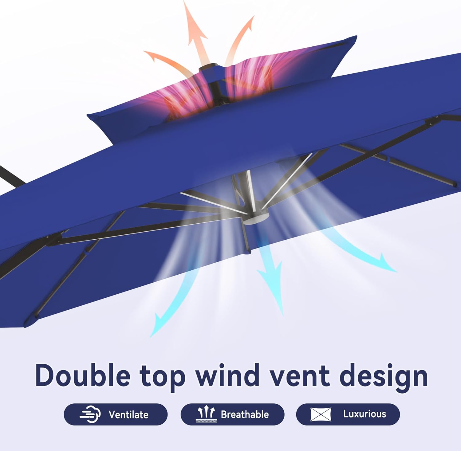- Wind-Resistant Vent Design: The innovative double-top vented canopy facilitates airflow and enhances stability, allowing the umbrella to withstand wind speeds up to 20 mph. (Note: We recommend closing the umbrella if winds exceed 30 mph).