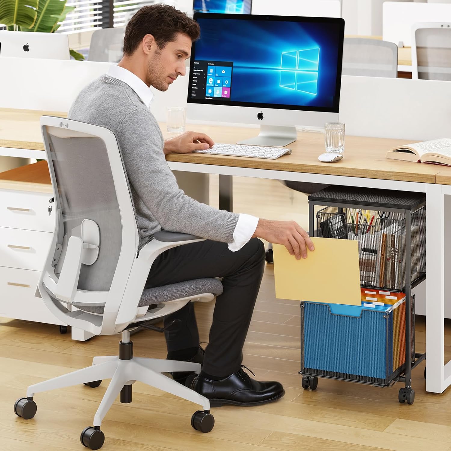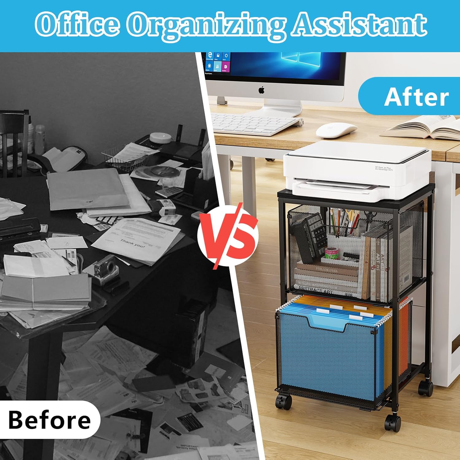 Secure Storage Solution: Features two deep storage drawers with a diamond mesh design for visibility and a built-in anti-pull-out safety mechanism to prevent accidental spills. The dedicated hanging file folder organizer keeps your critical documents neatly sorted and accessible.