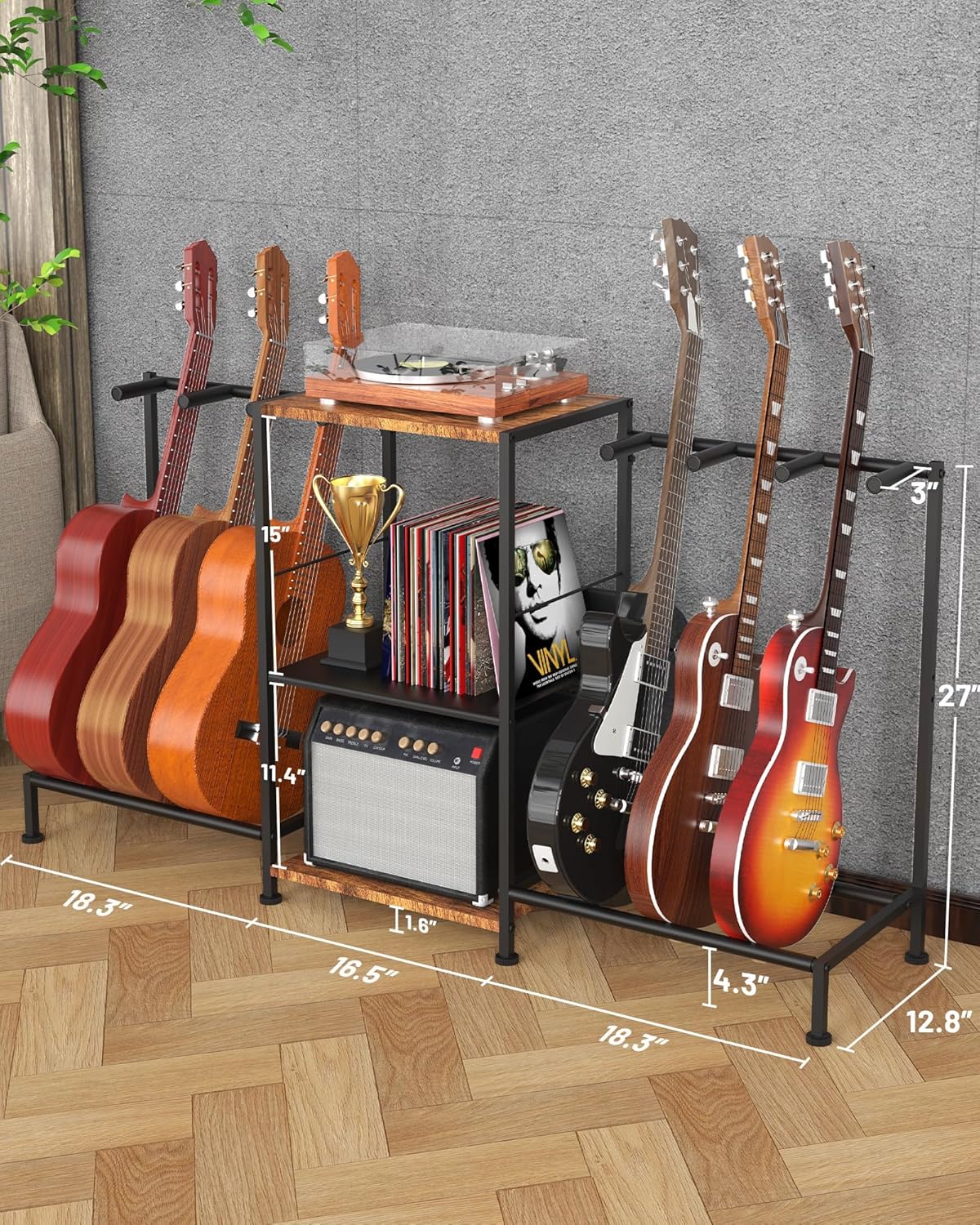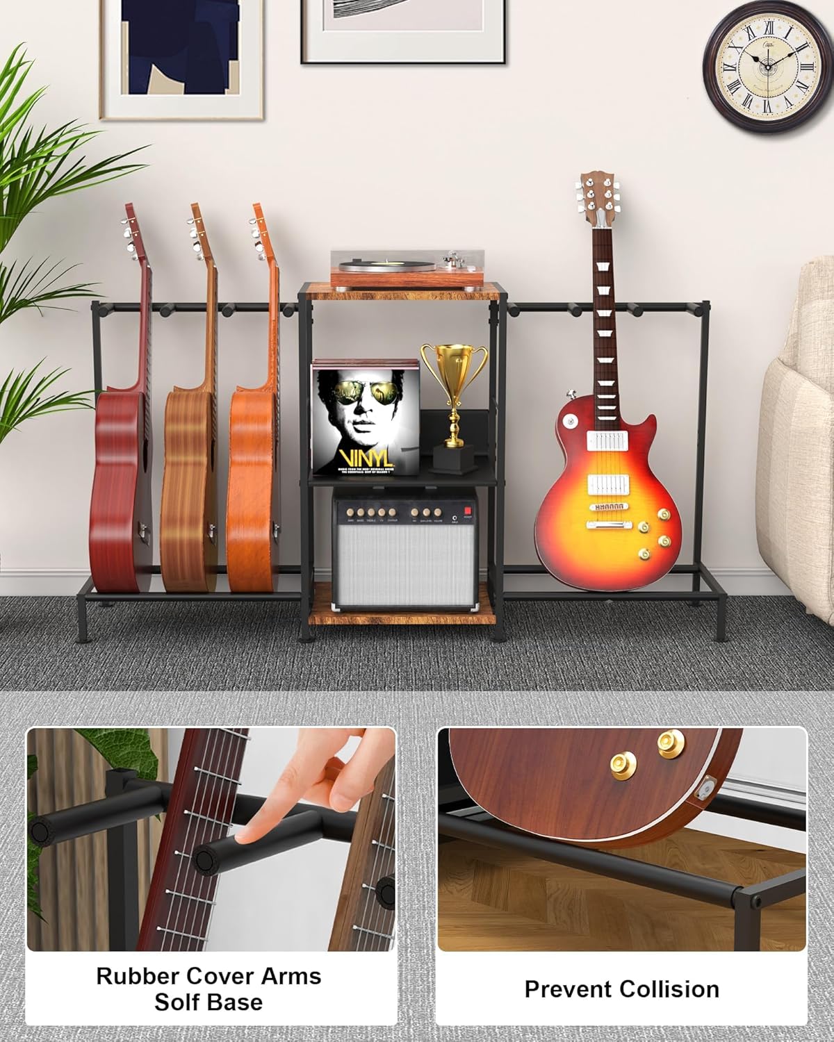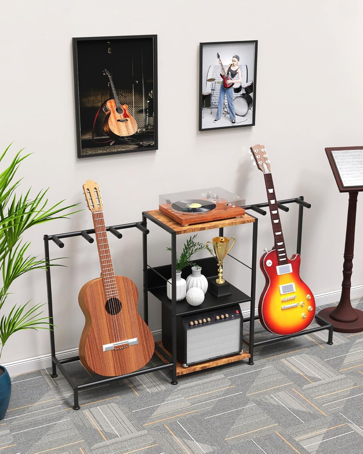 This isn’t just a guitar holder; it’s a complete music station. The spacious 53.1”L x 12.8”W x 27”H frame maximizes vertical space without occupying too much floor room. The innovative middle mesh shelf is perfect for storing your vinyl records, sheet music, audio interfaces, or even a turntable. Whether you are a professional musician or a passionate hobbyist, this rack organizes your gear in one compact, stylish unit.