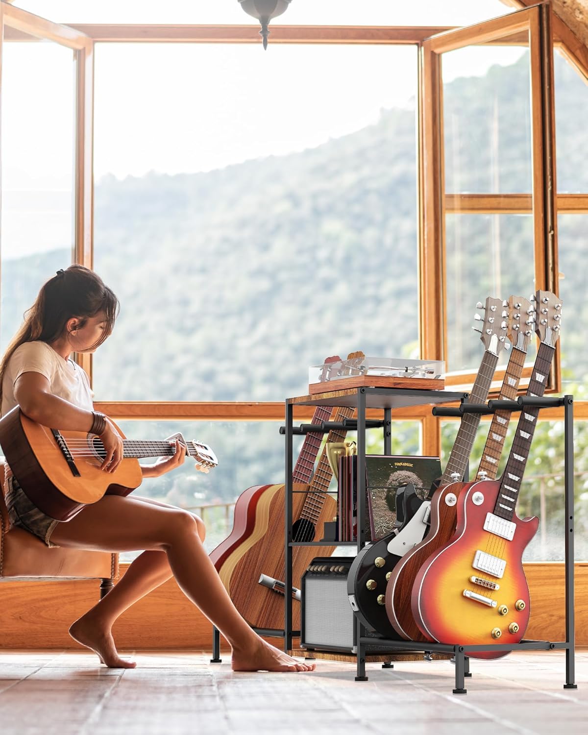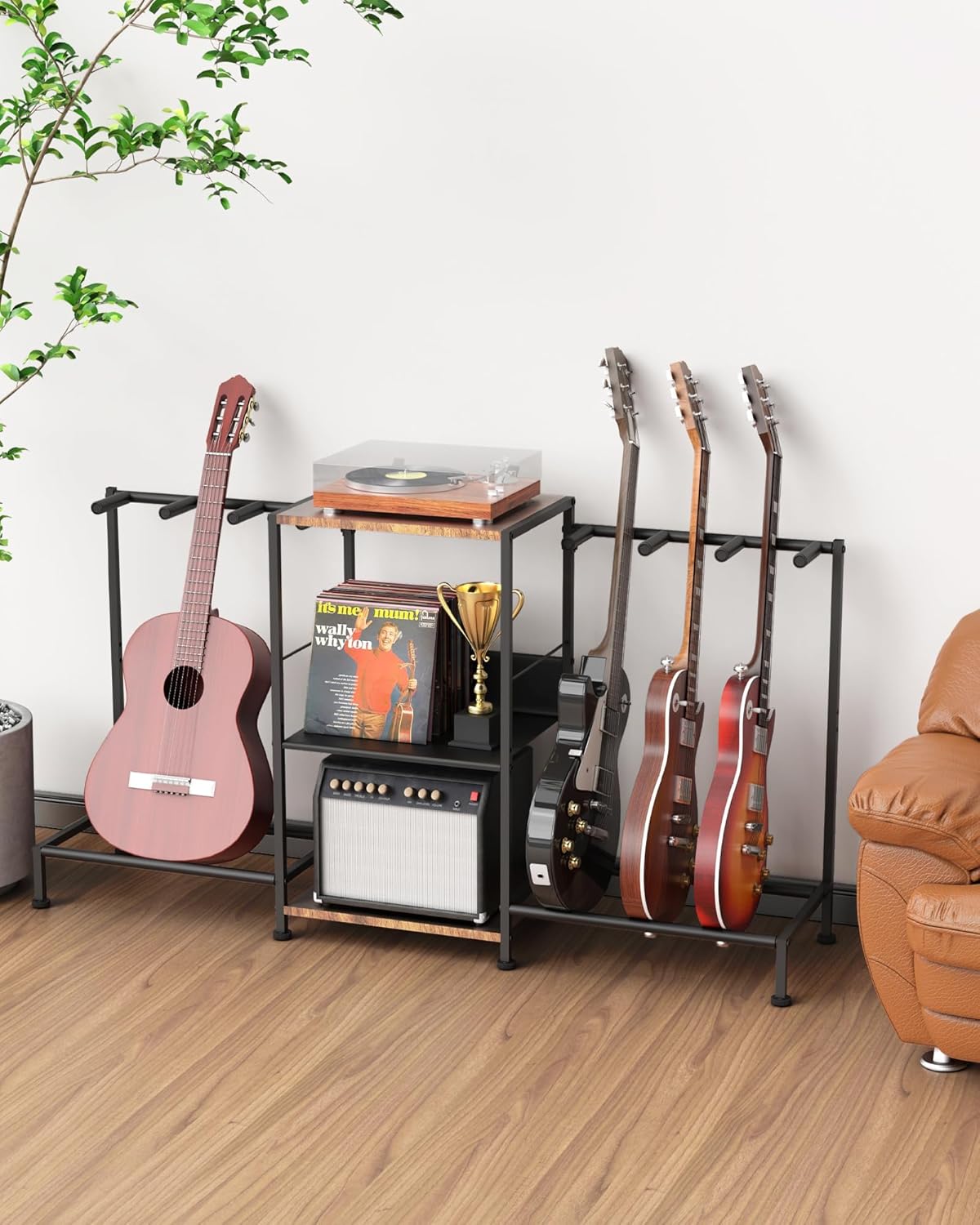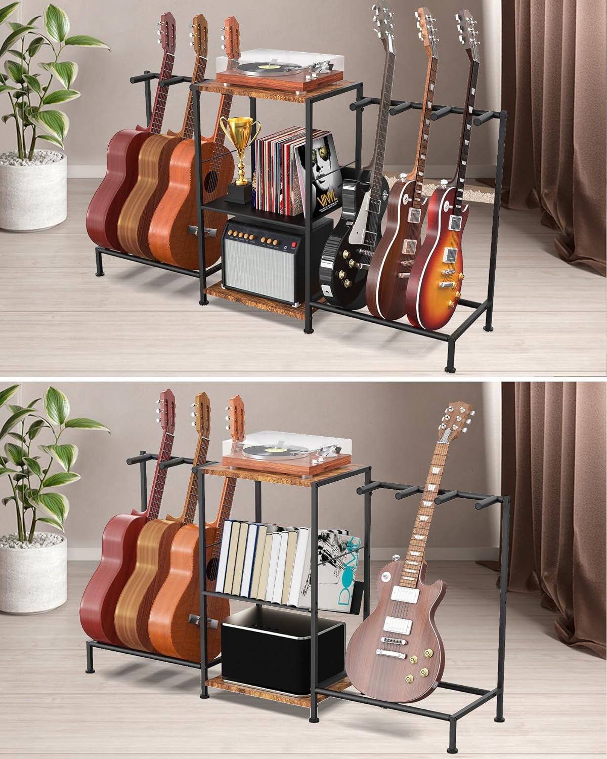 This isn’t just a guitar holder; it’s a complete music station. The spacious 53.1”L x 12.8”W x 27”H frame maximizes vertical space without occupying too much floor room. The innovative middle mesh shelf is perfect for storing your vinyl records, sheet music, audio interfaces, or even a turntable. Whether you are a professional musician or a passionate hobbyist, this rack organizes your gear in one compact, stylish unit.