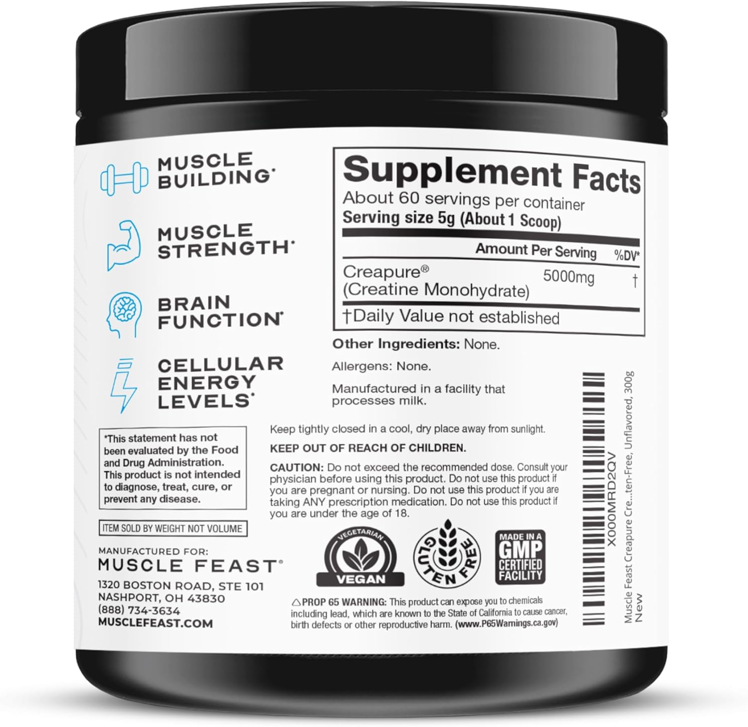 • MAXIMUM POTENCY: 300g container providing a full 60 servings of 5000mg premium creatine per scoop.