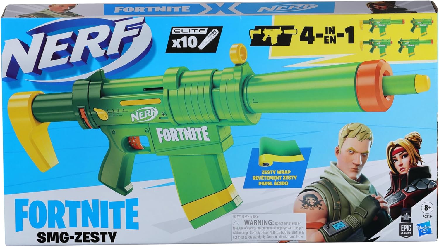 Bring the excitement of the video game into reality with this officially licensed Nerf Fortnite SMG-Zesty Blaster. Drawing direct inspiration from the iconic ‘Zesty’ Wrap skin in Fortnite, this foam blaster combines authentic in-game aesthetics with real-world performance. It is engineered for versatility, featuring a detachable stock and barrel extension that allow you to customize the blaster’s configuration for any battle scenario. Whether you need the compact profile for close-quarters combat or the extended barrel for improved long-range targeting, the SMG-Zesty adapts to your playstyle. Included in the box is a high-capacity 10-dart clip and 10 official Nerf Elite darts, ensuring you have enough ammunition to dominate the battlefield. The blaster is designed for easy operation: simply load the clip, prime the mechanism with the slide action, and pull the trigger to unleash a single dart. It is an ideal gift for Fortnite enthusiasts, gamers, and active children aged 8 and up. Please note that safety eyewear is recommended (sold separately) and no batteries are required for operation.