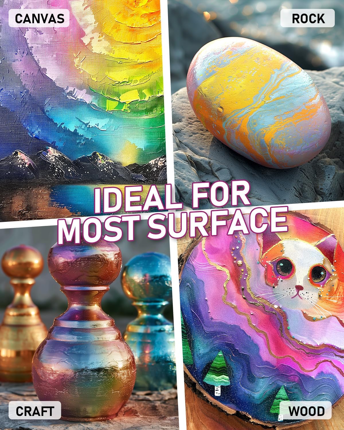 Safety meets performance. Nicpro acrylics conform to strict ASTM D-4236 and EN71 standards, making them non-toxic, acid-free, and safe for artists of all ages. These versatile paints adhere perfectly to a wide variety of surfaces, including canvas, fabric, wood, rocks, glass, and ceramics. They are the perfect choice for beginners, professional painters, DIY crafts, and holiday decorations.