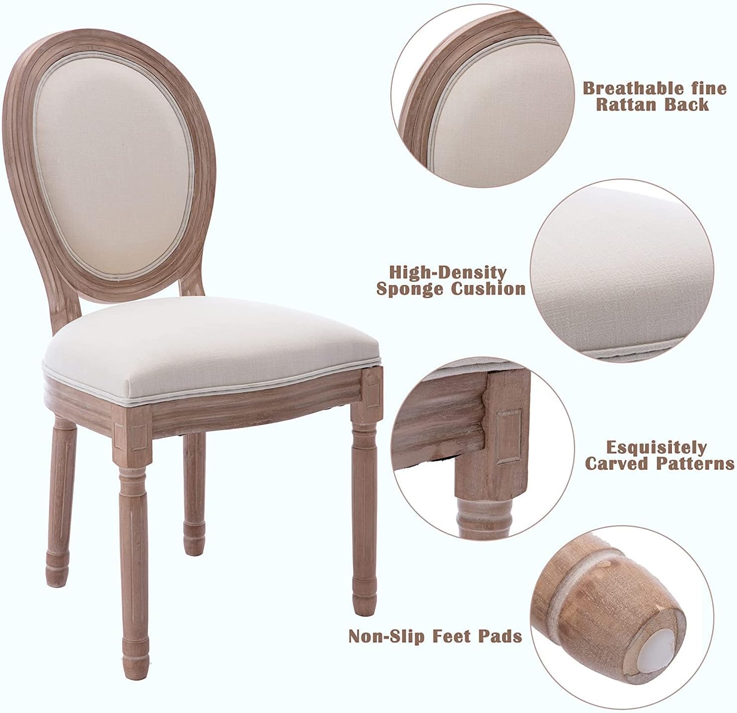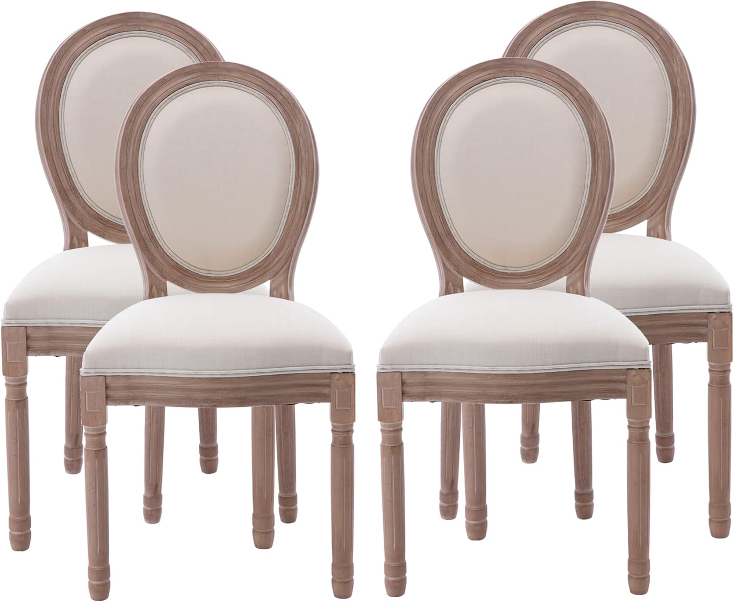 Elevate your dining experience with the Nrizc French Country Dining Chairs, a set of 4 that seamlessly blends vintage charm with modern comfort. Designed to bring a touch of rustic elegance to your home, these chairs feature an exquisite round back design crafted from linen beige fabric that contrasts beautifully with the bright oak color solid wood legs.