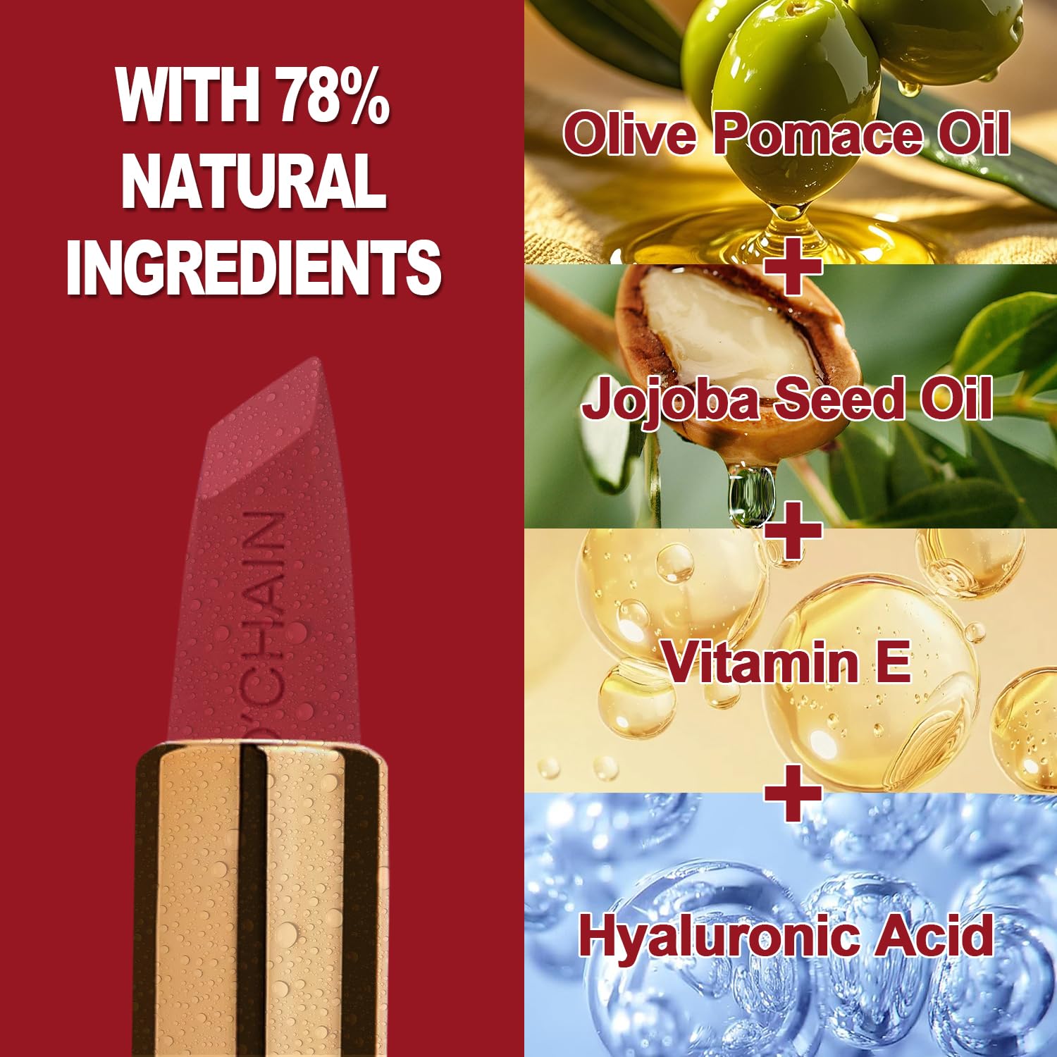 Introducing the O’CHAIN Red Matte Lipstick in the stunning 11 CHERRY shade – your new go-to for bold, beautiful lips that last all day. This luxurious matte lipstick delivers full coverage with a velvety-smooth finish that feels impossibly lightweight on your lips. Crafted with a nourishing blend of refined olive oil, jojoba oil, hyaluronic acid, and vitamin E, this formula provides intense moisturization while offering powerful antioxidant benefits. Say goodbye to dry, uncomfortable lips – this matte lipstick locks in hydration for a soft, supple feel that never feels tight or cakey. The advanced waterproof formula resists sweat, humidity, and smudging, ensuring your vibrant cherry-red color stays flawless from morning until night without constant touch-ups. The high-pigment concentration ensures effortless one-swipe application with buildable coverage that conceals imperfections and evens out your natural lip color. The elegantly designed packaging features a chic diamond-inspired pattern with white and gold accents, making it a perfect gift for the beauty lover in your life. O’CHAIN is committed to clean beauty – this lipstick is 100% vegan, gluten-free, and never tested on animals. Achieve that coveted sophisticated pout with confidence, knowing you’re using a product that cares for your lips as beautifully as it makes them look.