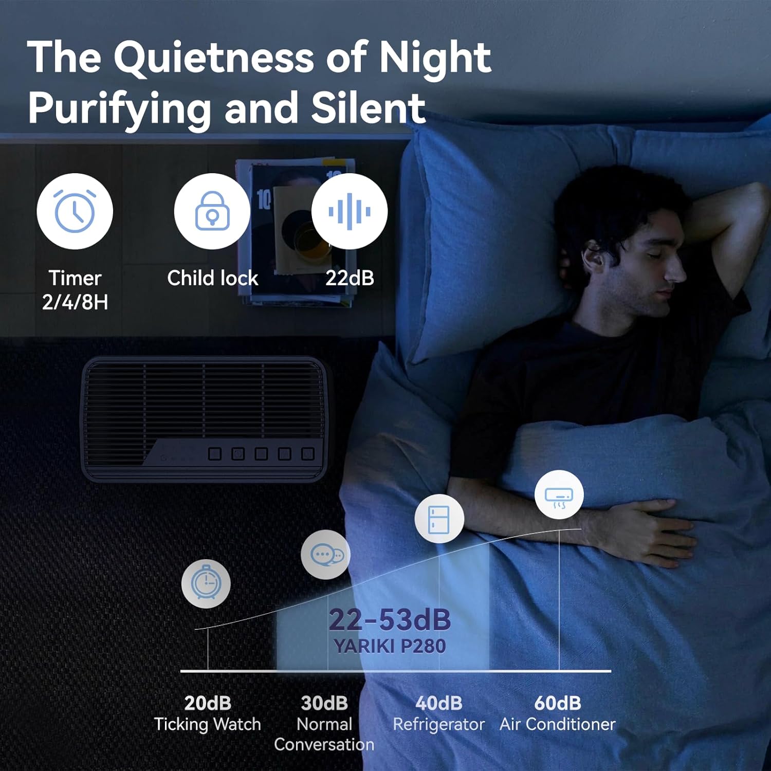 • Ultra-quiet 22dB operation – perfect for bedrooms and sleep