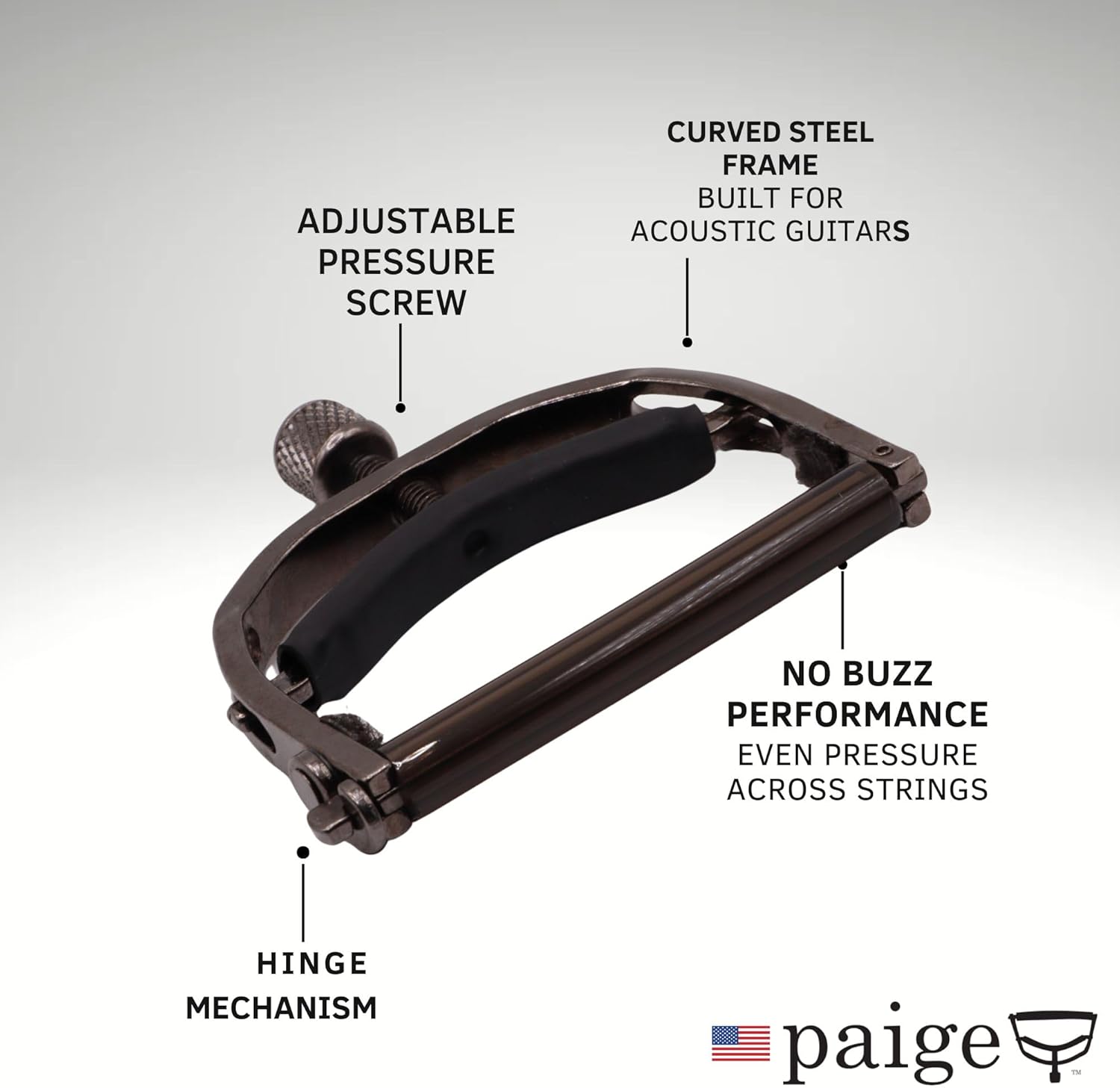 Elevate your playing with the Paige 6-String Guitar Capo, expertly manufactured in the USA to meet the exacting standards of professional musicians. Designed for acoustic 6-string guitars, this capo delivers consistent intonation and reliable durability, ensuring your performance remains pitch-perfect night after night.