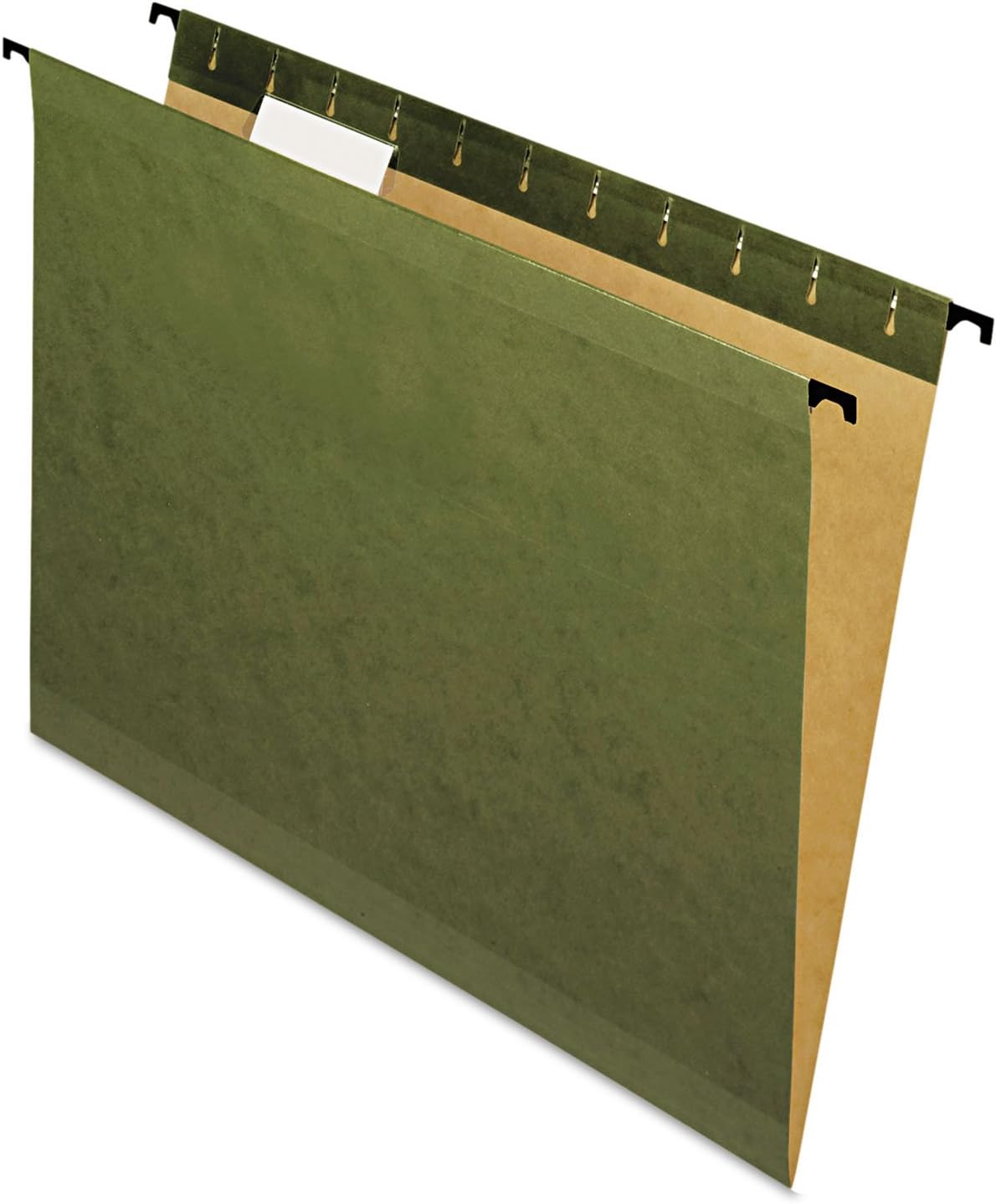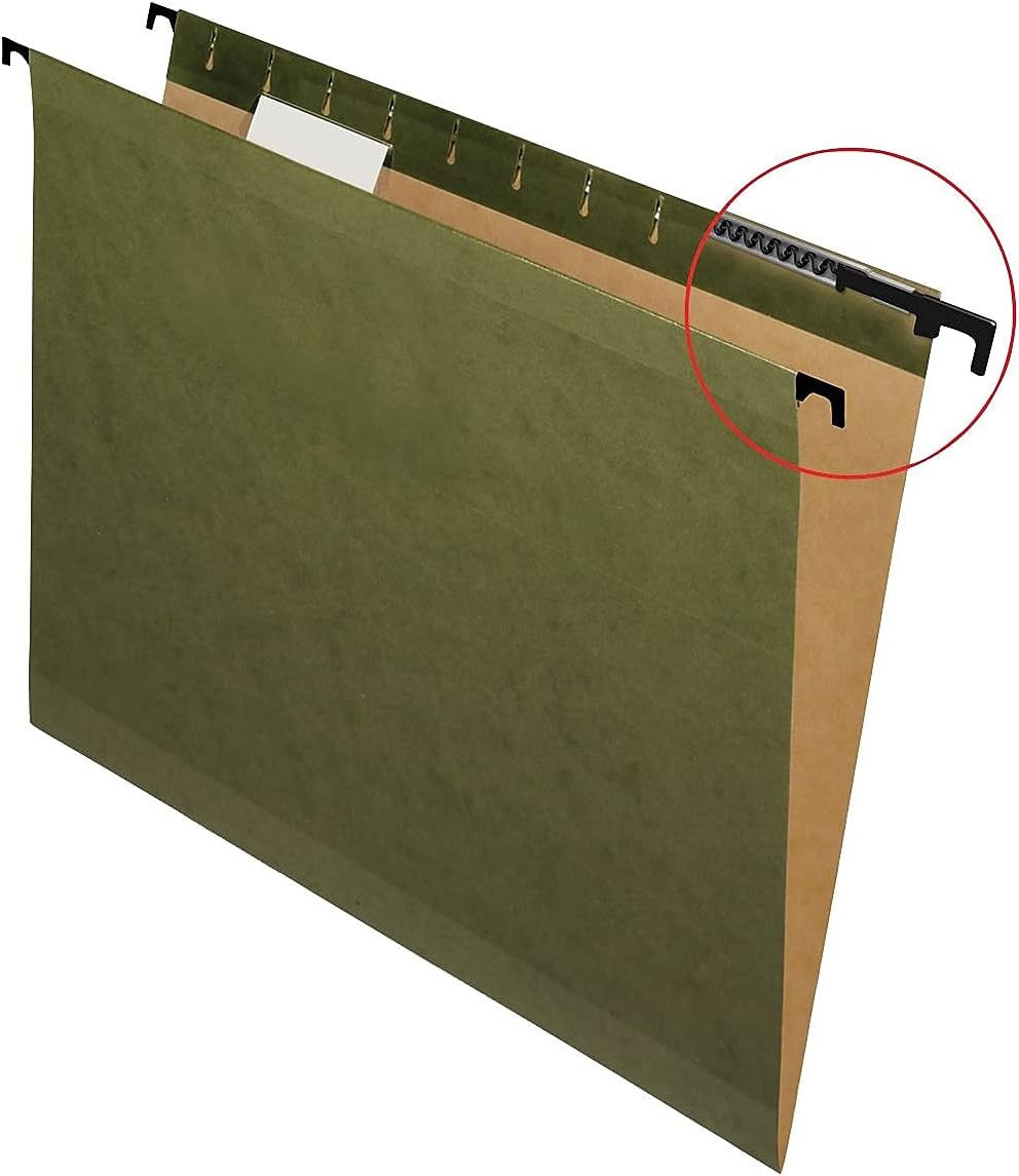 Letter-size hanging folders with SureHook technology and tension springs to prevent falling into drawers. Durable 11 pt. covers. Includes label sheet. Eco-friendly recycled fiber. Standard green. 20 per box.