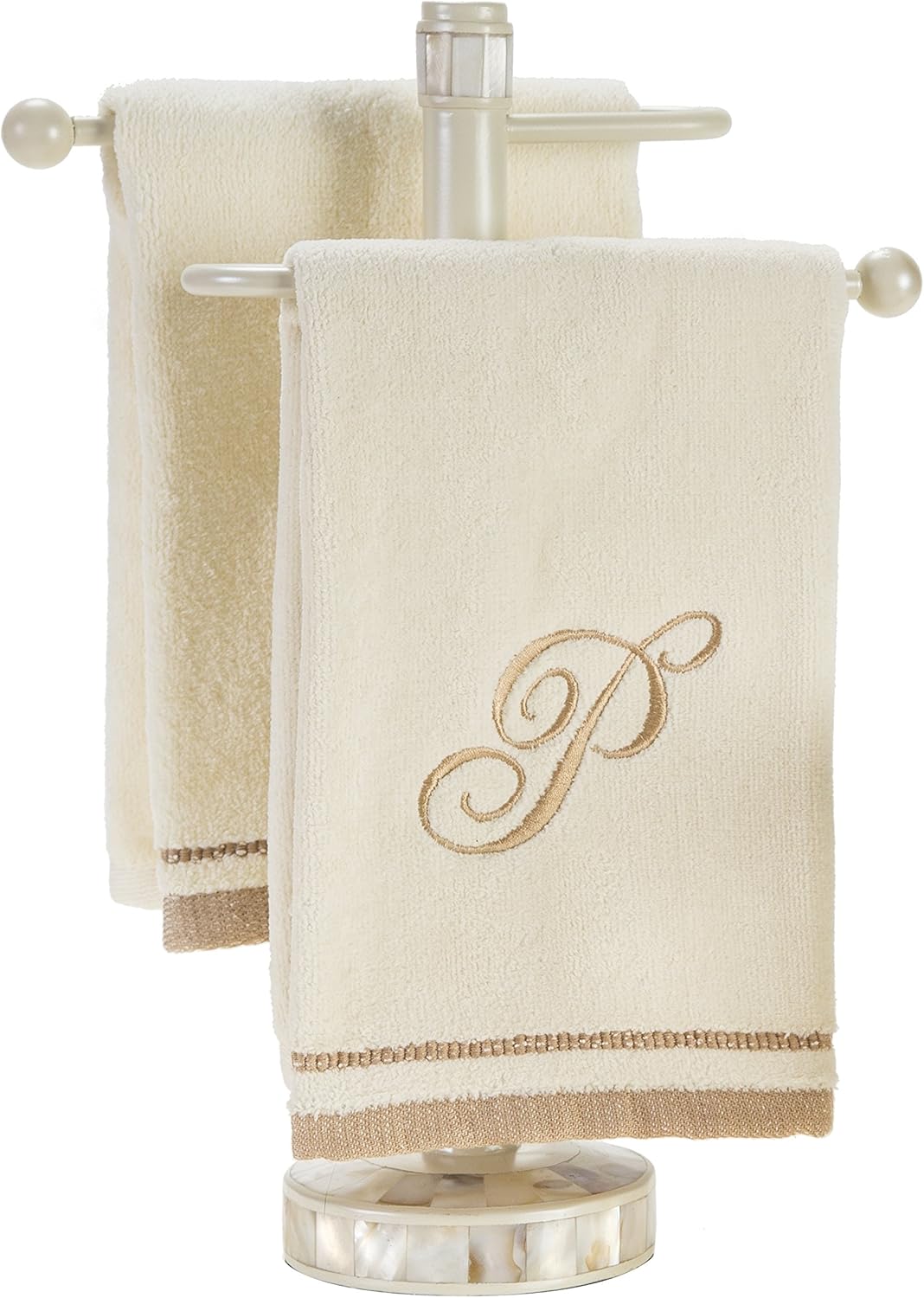 Elevate your home décor with these exquisite Personalized Monogrammed Fingertip Towels. Meticulously crafted to blend functionality with elegance, this set of four towels is designed to add a touch of sophistication to your bathroom or kitchen. Each towel features a beautifully embroidered letter in rich golden brown thread against a luxurious ivory background, creating a timeless look that complements a variety of interior styles.
