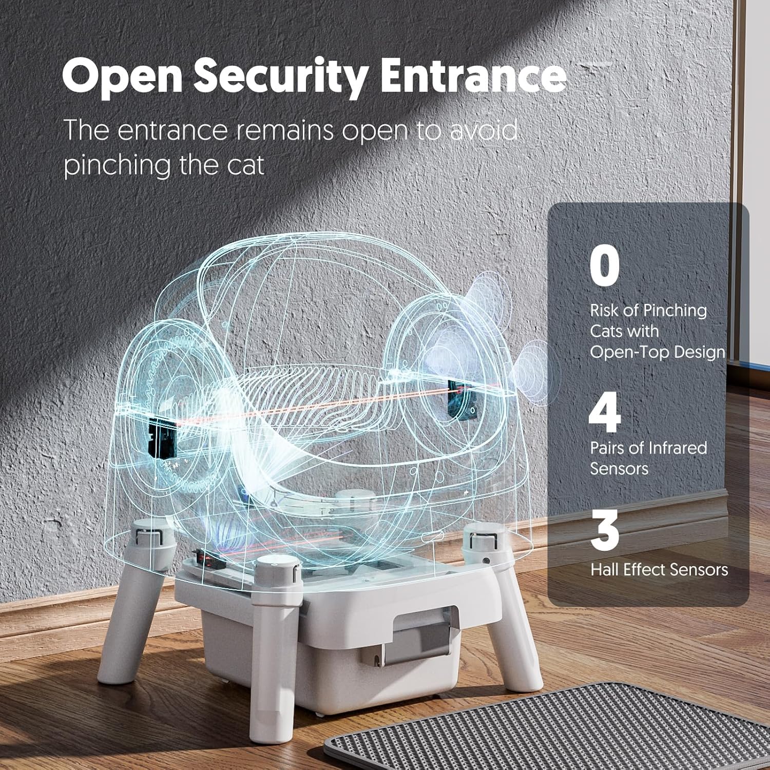 Advanced Safety for Peace of Mind: Engineered with your pet’s safety as the top priority, the PetPivot utilizes dual-layer protection with precision Infrared and Hall sensors. These smart sensors instantly detect your cat’s presence, immediately halting the cleaning cycle if they enter. The anti-pinch design and “scissor angle” mechanism further ensure a risk-free environment, preventing injuries and offering total security for multi-cat households.