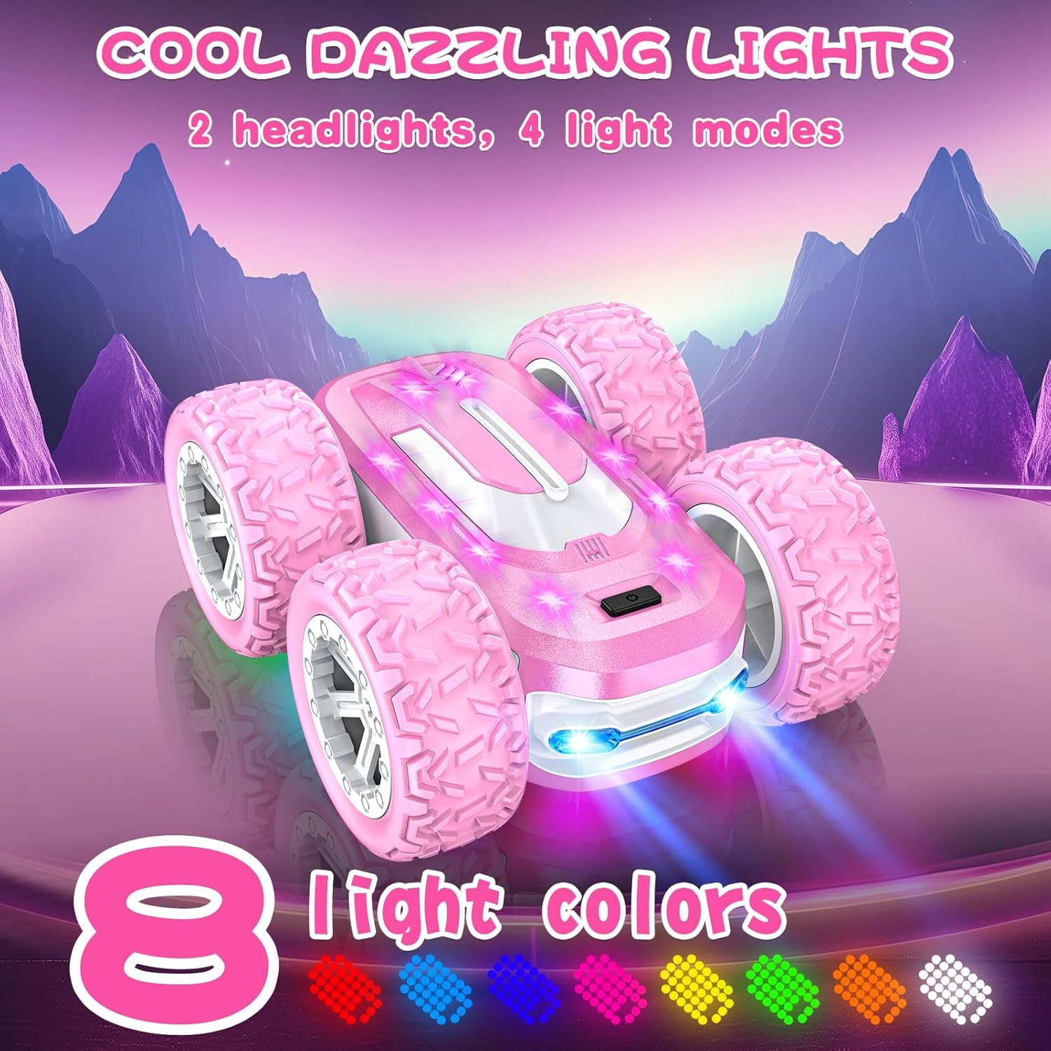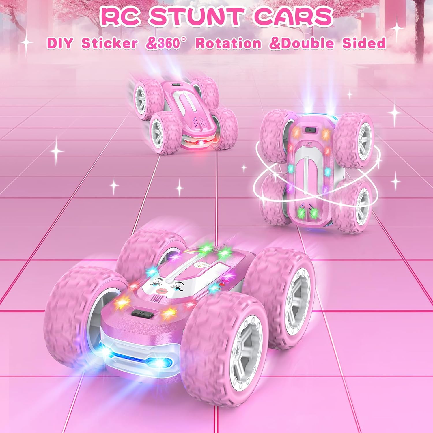 Pink RC Car for Girls – 2.4GHz 360° Stunt Car with LED Lights, DIY Stickers & Rechargeable Battery, Perfect Birthday Gift for Kids Ages 4-12