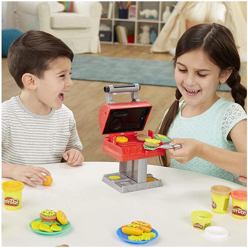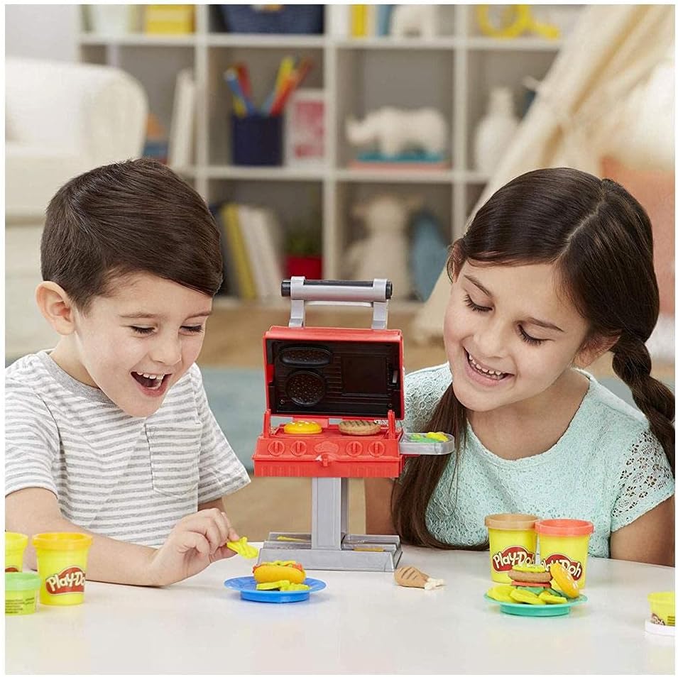 - COMPLETE PLAYSET: Includes 6 non-toxic Play-Doh colors in 2 and 1-ounce cans and 7 toy accessories, including tongs, forks, and a stamping grill.
