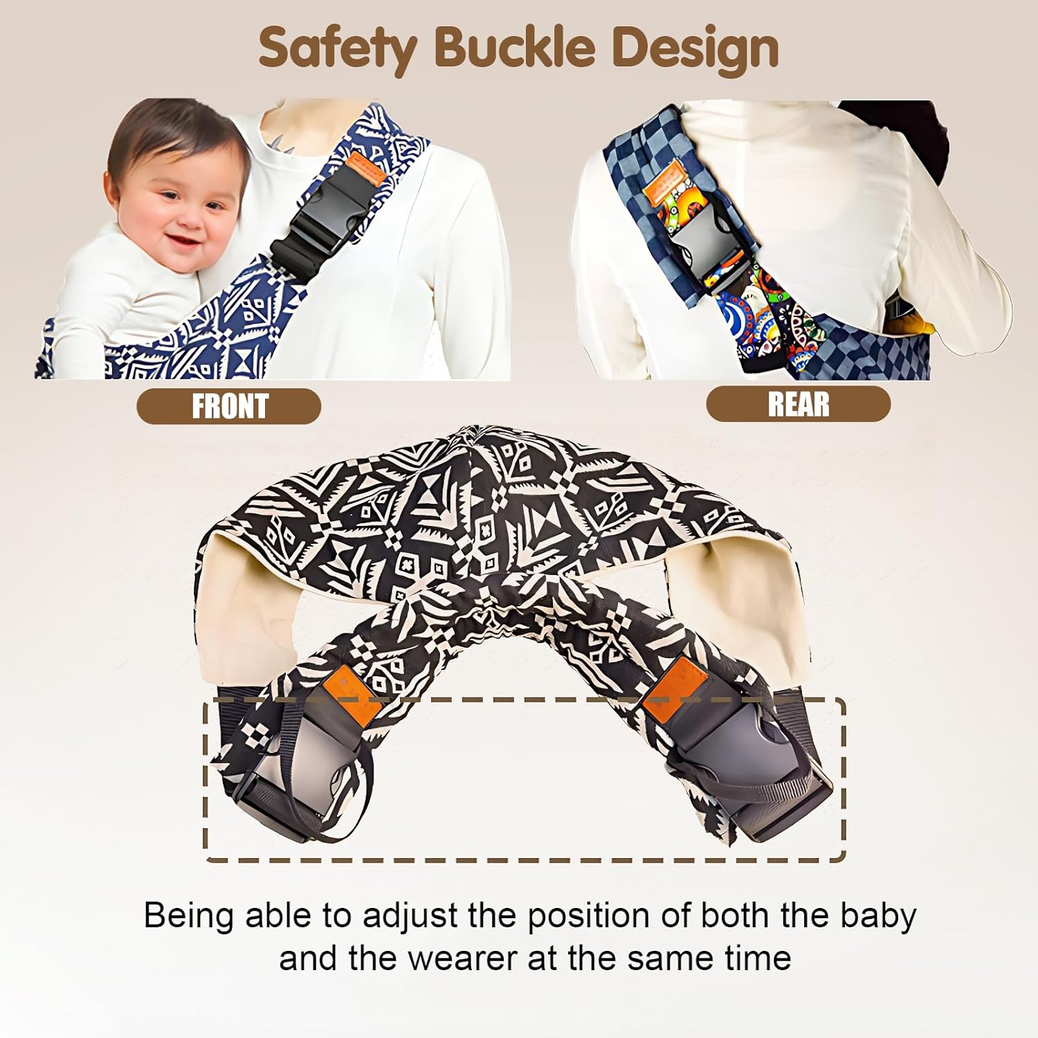 Enhanced Safety Features:We prioritize your child’s security above all else. This carrier is equipped with heavy-duty safety buckles on both the front and back to prevent accidental slipping or loosening, giving you peace of mind while you move. Note: Always keep one hand supporting the baby’s back while adjusting the carrier.