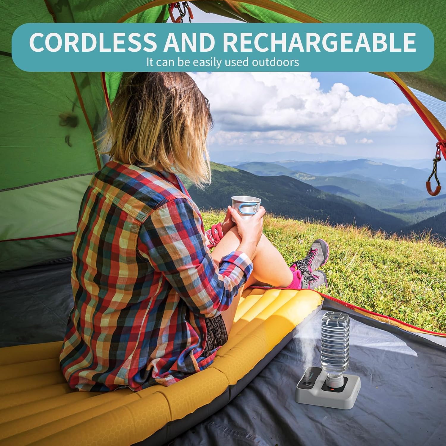 Weighing a mere 7.2 ounces and measuring just 5.91 inches, this device fits effortlessly into your hand, backpack, or suitcase. It features a versatile design that screws onto most standard water bottles, eliminating the need for a bulky water tank. It is the perfect companion for camping, business trips, or simply moving from room to room.