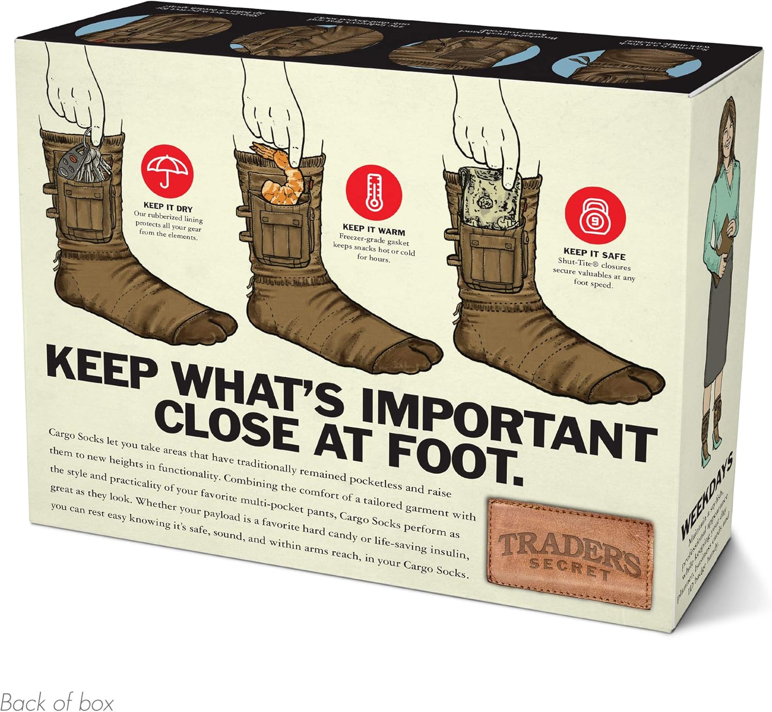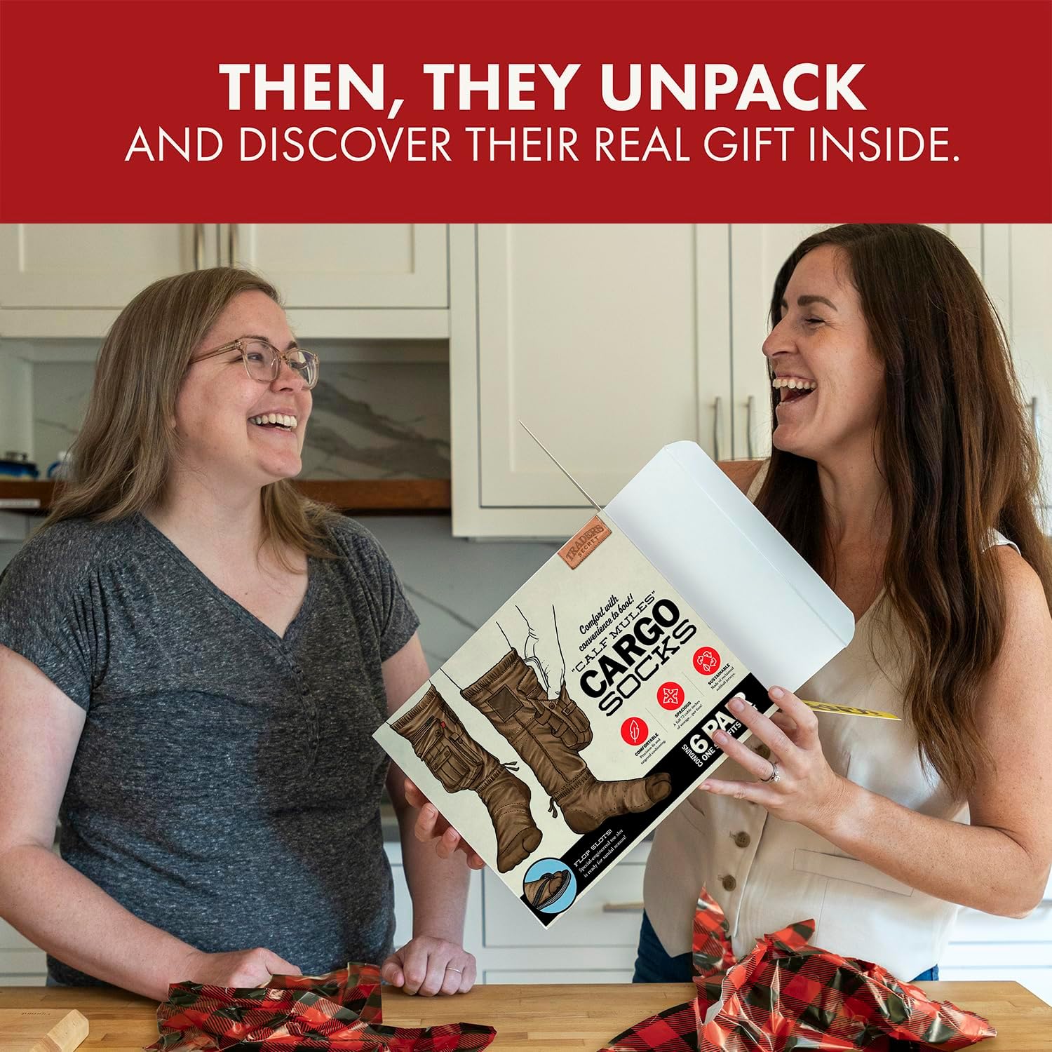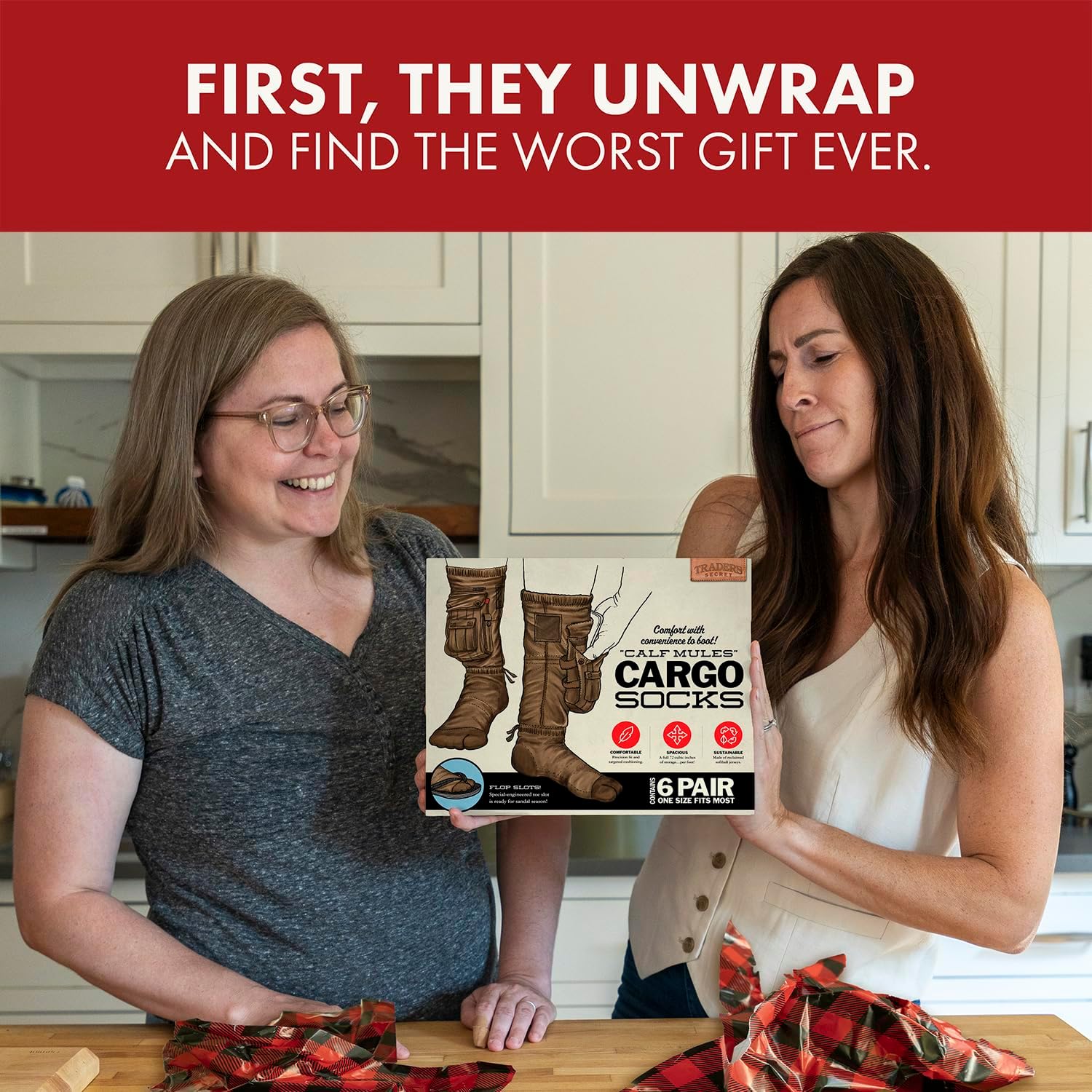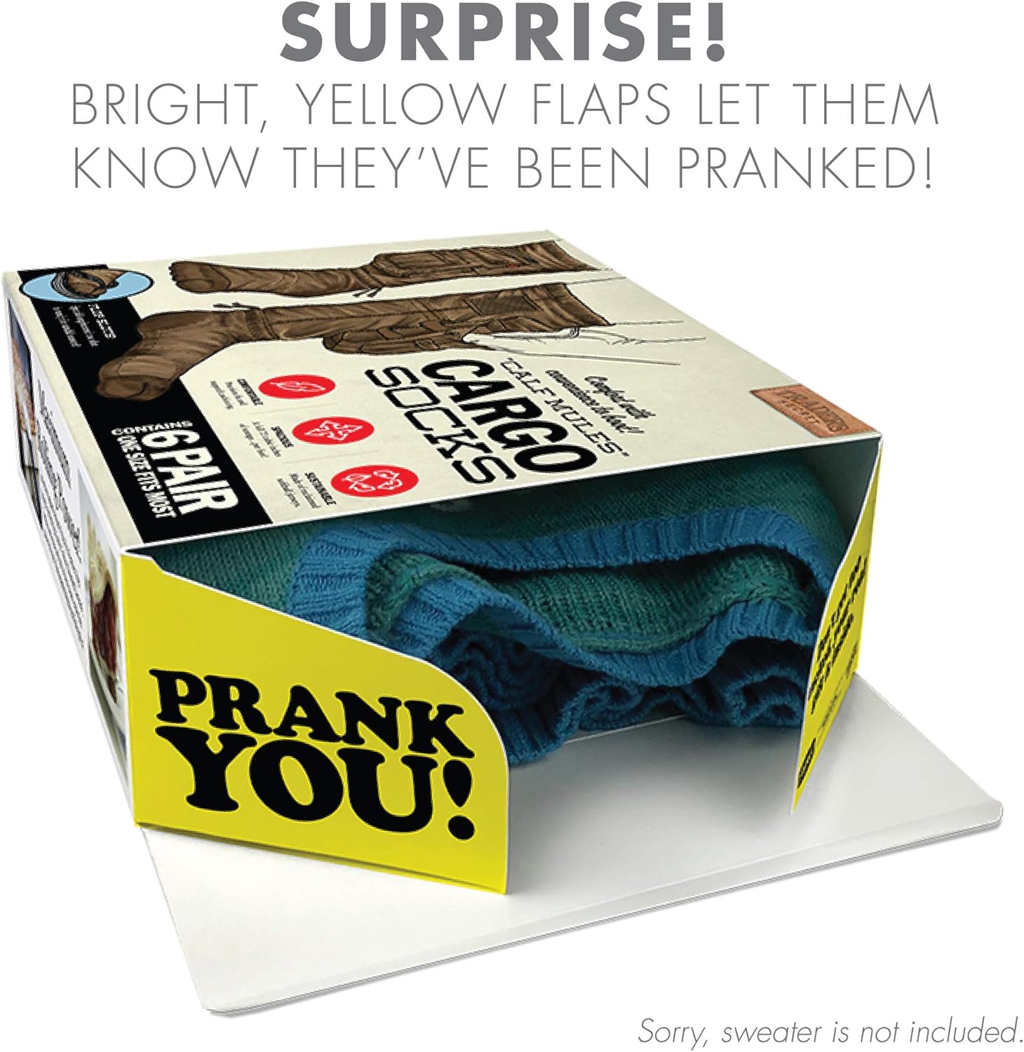 - The Ultimate Prank: Disguise your real gift inside this box featuring the bizarre “Cargo Socks” invention. It’s the gag that keeps on giving until they open the box and discover their real present.
