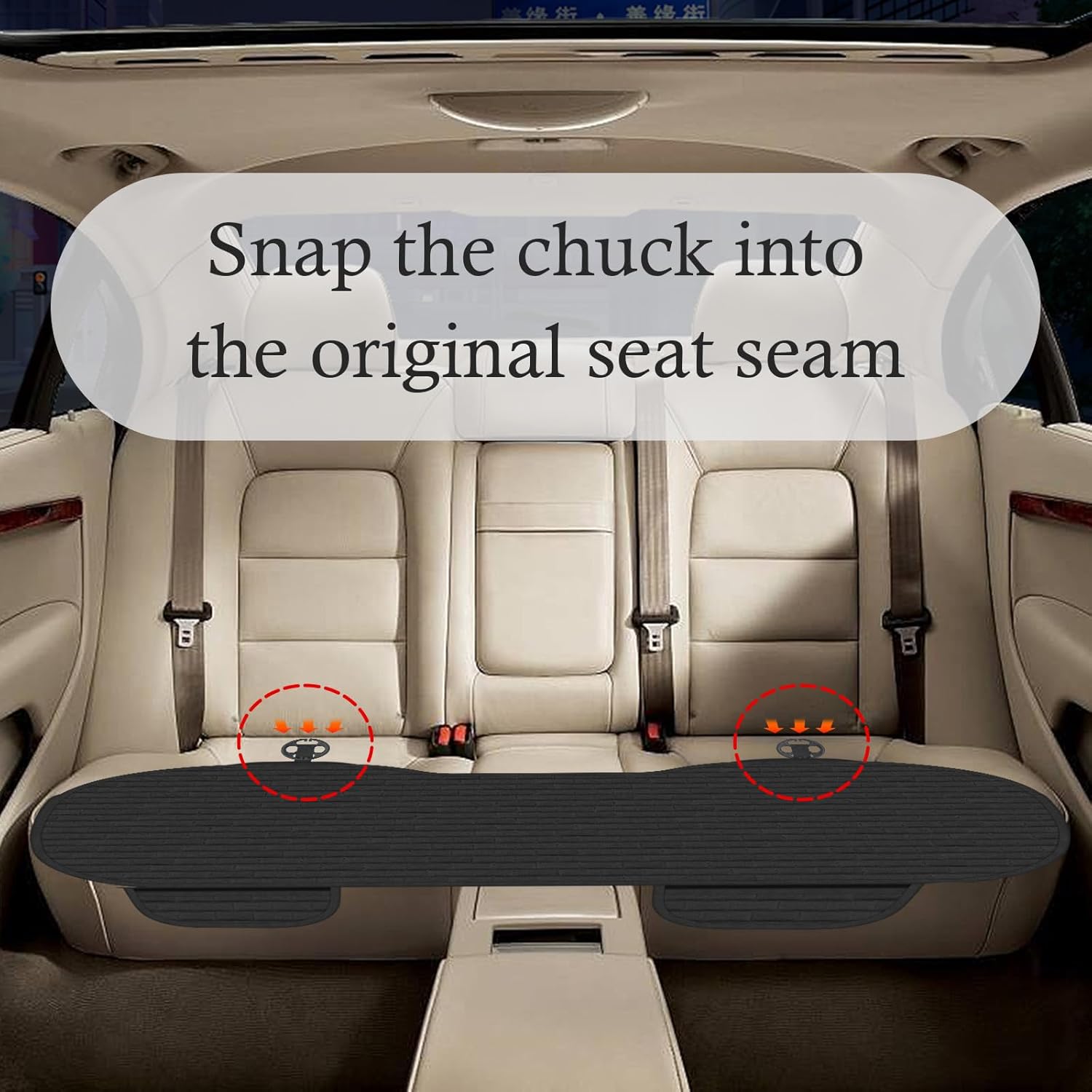 - Universal Fit & Easy Setup: Designed to fit most standard car, SUV, and truck rear bench seats (Size: 51.57″ x 22.83″). The intelligent design leaves seat belt sockets fully exposed, so safety remains uncompromised. Installation is tool-free—simply secure the included elastic straps and chucks.