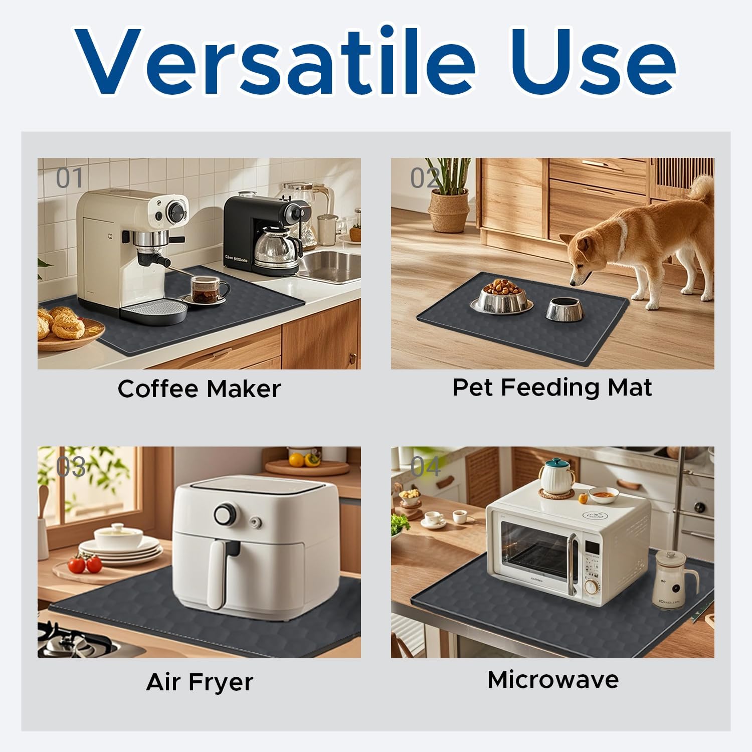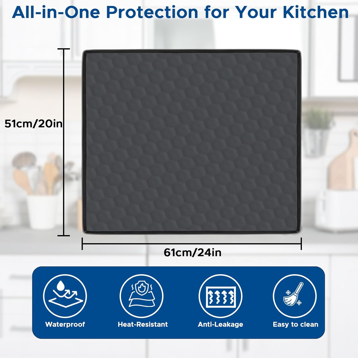 • Premium food-grade silicone construction – waterproof, heat-resistant, and durable• 24″ x 20″ size with raised edges to prevent leaks and floor damage• Reduces dishwasher noise for a quieter kitchen• Versatile use under coffee makers, air fryers, microwaves, and more• Easy to clean and store – flexible design folds conveniently