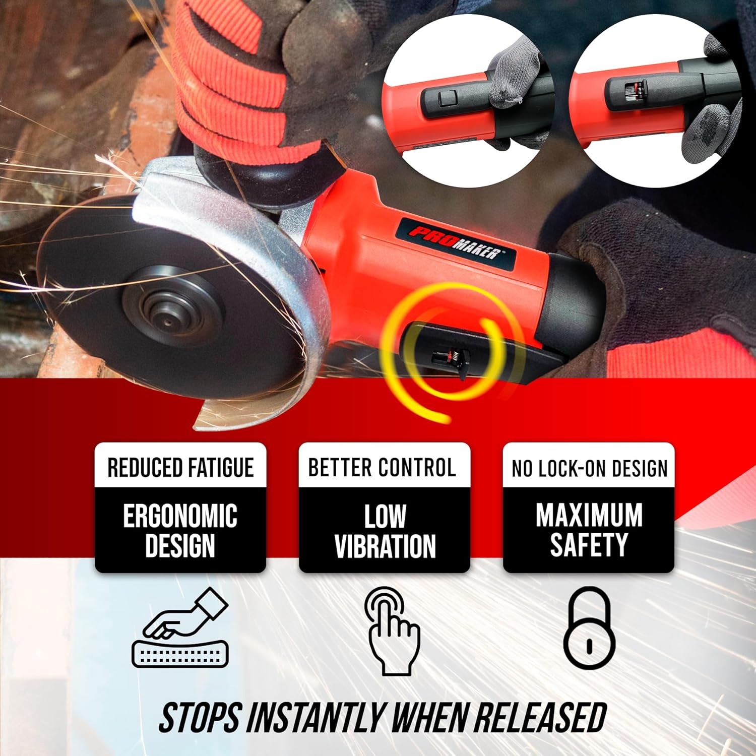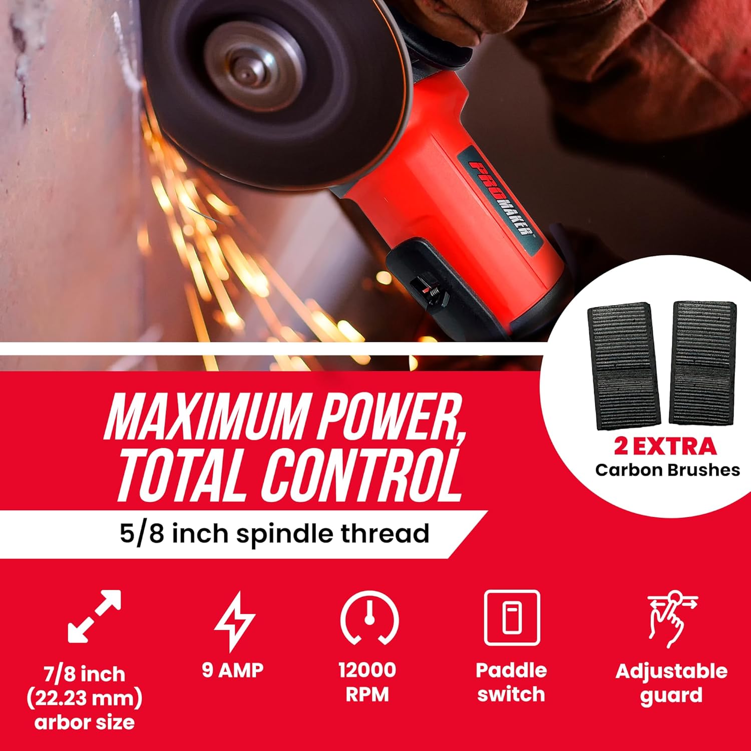 Tackle tough metalwork projects with the PROMAKER 9 Amp Angle Grinder, engineered for both professionals and dedicated DIY enthusiasts. This powerful 4-1/2 inch angle grinder delivers an impressive 12,000 RPM, providing the raw power needed for heavy-duty cutting, grinding, and polishing tasks. Whether you’re refinishing automotive parts, fabricating metal structures, or preparing surfaces for welding, this grinder handles it all with exceptional performance and reliability. The innovative paddle switch design eliminates the traditional lock-on mechanism, offering instant stop capability that enhances workplace safety and gives you precise control during detailed work. Reduce operator fatigue with this advanced safety feature that prevents accidental starts. The tool-free quick release guard rotates and locks securely within seconds, allowing you to quickly switch between cutting, grinding, and polishing operations without hassle. The 3-position auxiliary handle mounts on the left, right, or top to maximize control, balance, and comfort during extended use. Everything you need to start working immediately is included: four 36-grit flap discs for aggressive material removal, one grinding wheel for versatile applications, and two extra carbon brushes to extend the tool’s operational life. Backed by a 2-year warranty and dedicated customer support.