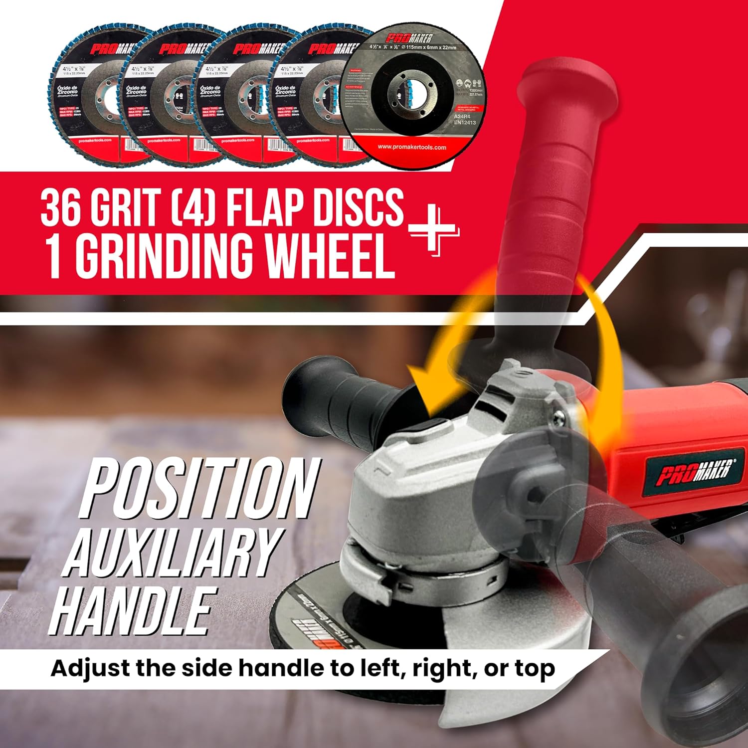 PROMAKER 9 Amp Angle Grinder – 4-1/2 Inch Paddle Switch Power Tool with 12000 RPM, Adjustable Guard, 36 Grit Flap Discs, Grinding Wheel & 2-Year Warranty