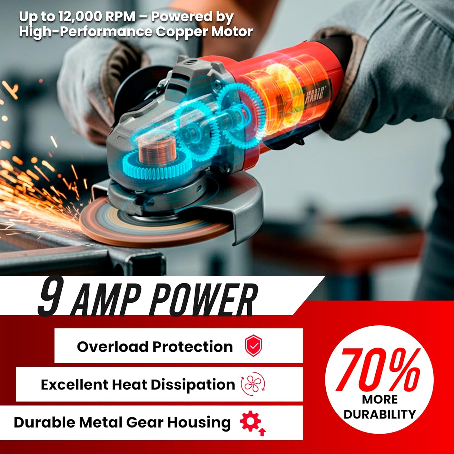 9 Amp motor delivers 12,000 RPM for heavy-duty cutting, grinding & polishing. Paddle switch provides instant stop and enhanced safety. Includes 4 flap discs, grinding wheel, 2 carbon brushes. Tool-free adjustable guard with 3-position handle. 2-year warranty.
