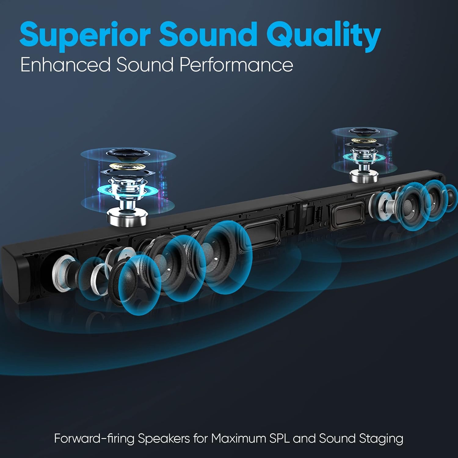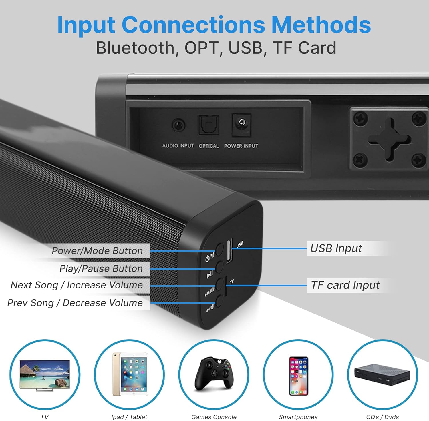 - MULTIPLE CONNECTIONS: Equipped with Optical (Toslink), 3.5mm AUX, and USB/TF Card inputs for versatile connectivity with TVs and other devices.