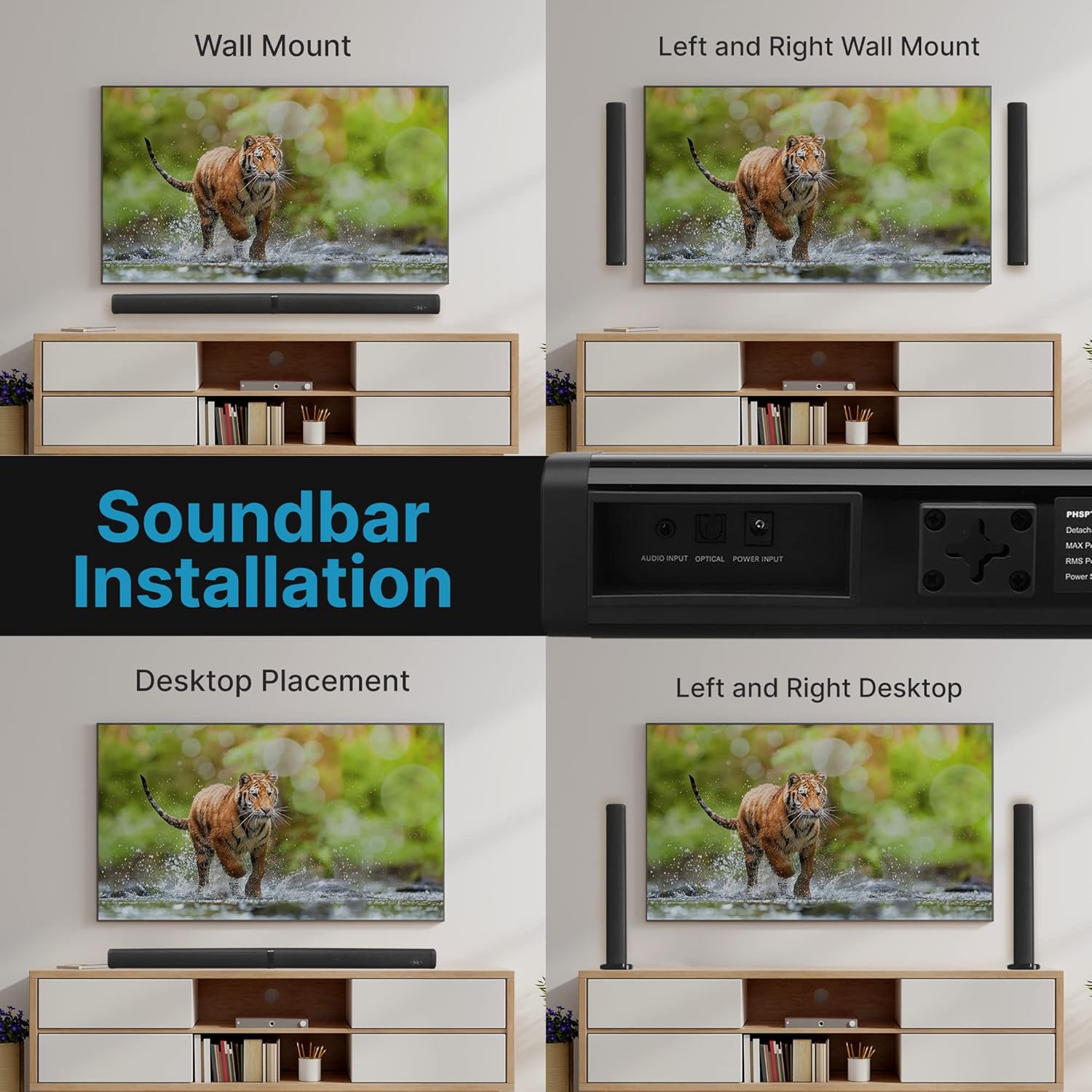 Designed to adapt to your space, this soundbar features a unique detachable design, allowing you to separate the unit or mount it flush against your wall using the included hardware. Whether you place it on a stand under your TV or mount it for a minimalist look, the forward-firing speakers ensure maximum sound pressure and wide audio staging for movies, music, and games.