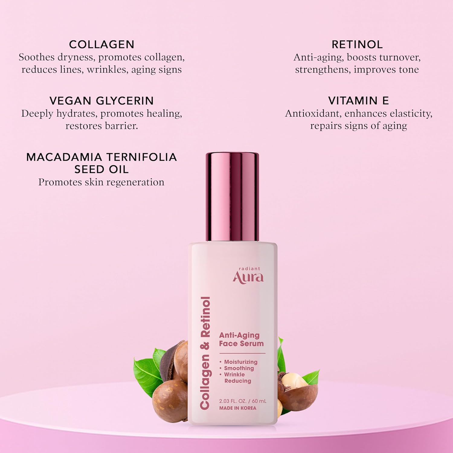 Elevate your skincare routine with the Radiant Aura Collagen & Retinol Face Serum, a dermatologist-tested fusion of K-beauty innovation and potent anti-aging actives. This silky, fast-absorbing serum is specifically engineered to target the signs of aging, combining the firming power of Vegan Collagen with the texture-refining benefits of Retinol. Designed for mature, tired, or dry skin, it works tirelessly to smooth fine lines, boost elasticity, and restore a youthful, radiant glow.