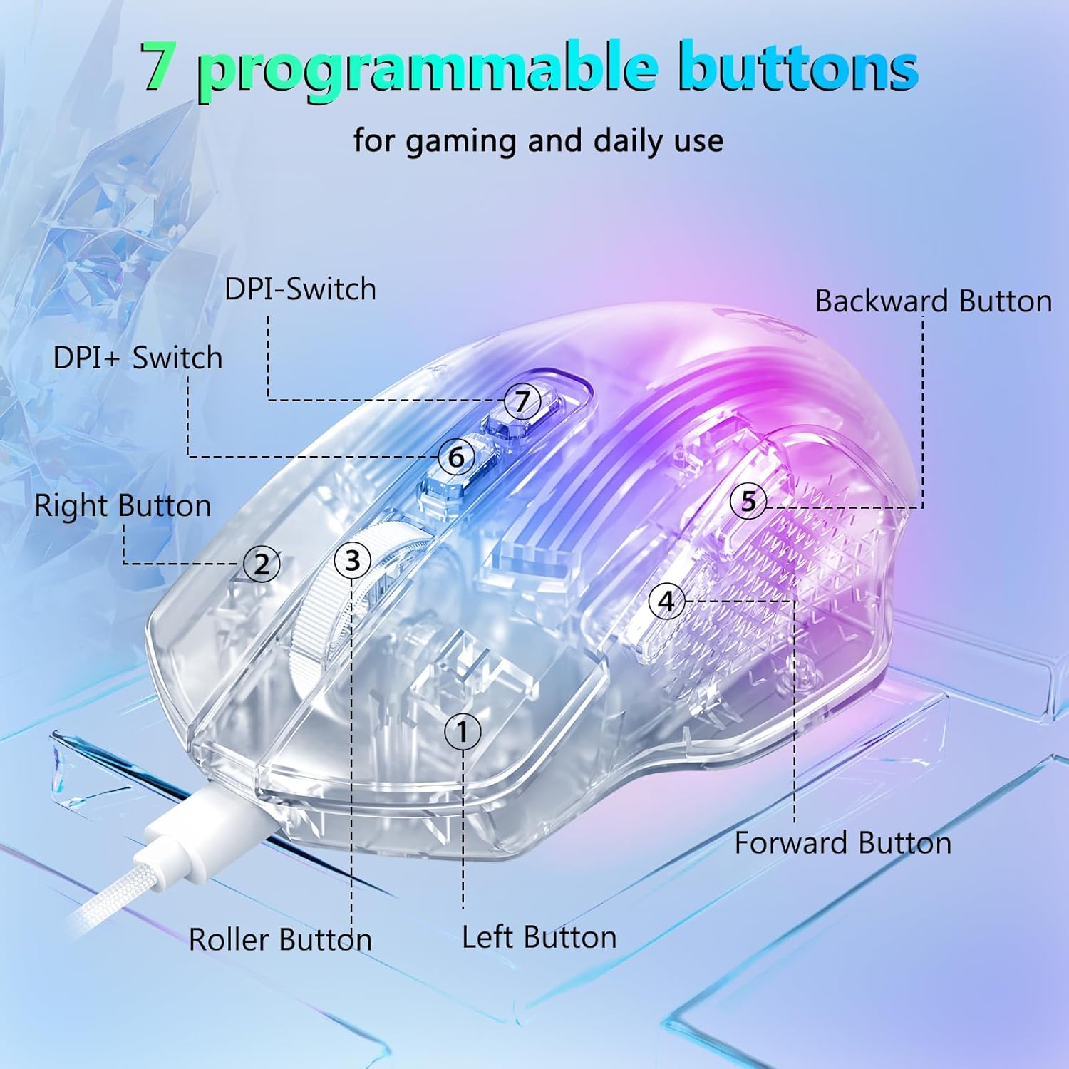 Experience a perfect blend of aesthetics and performance with the Redragon M695CT Transparent Wired Gaming Mouse. Designed for gamers who demand precision and style, this mouse features a fully transparent crystal-clear shell that exposes its internal mechanical beauty, illuminated by 8 dynamic RGB lighting modes. Whether you are playing fast-paced FPS games or navigating creative software, the high-precision optical sensor offers adjustable DPI settings from 100 to 24,000, ensuring pixel-perfect accuracy. The ergonomic shape is crafted to fit naturally in your hand, reducing fatigue during marathon gaming sessions, while the 7 programmable buttons allow you to customize keybinds and macros for a competitive edge. Equipped with a high-speed braided cable and a broad compatibility range for Windows, Mac, and Xbox, the M695CT is the ultimate upgrade to your battlestation.