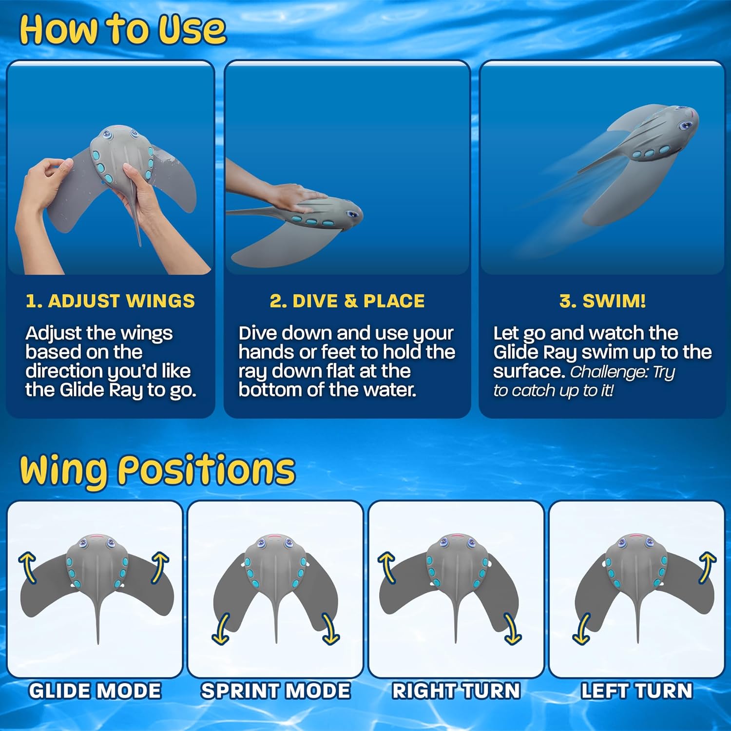 - GLIDES LIKE A REAL STINGRAY: A self-propelling underwater toy that mimics the movement of a marine animal, offering a unique alternative to standard torpedoes and dive sticks.