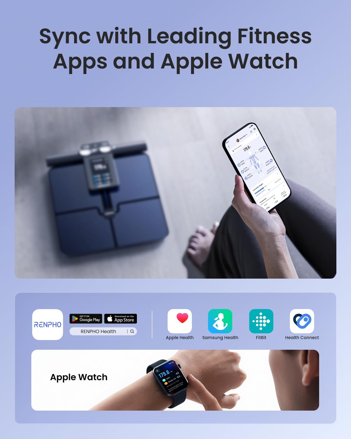 - SMART APP SYNC: Connects to the RENPHO Health App to track trends, print reports, and sync with Apple Health/Google Fit.