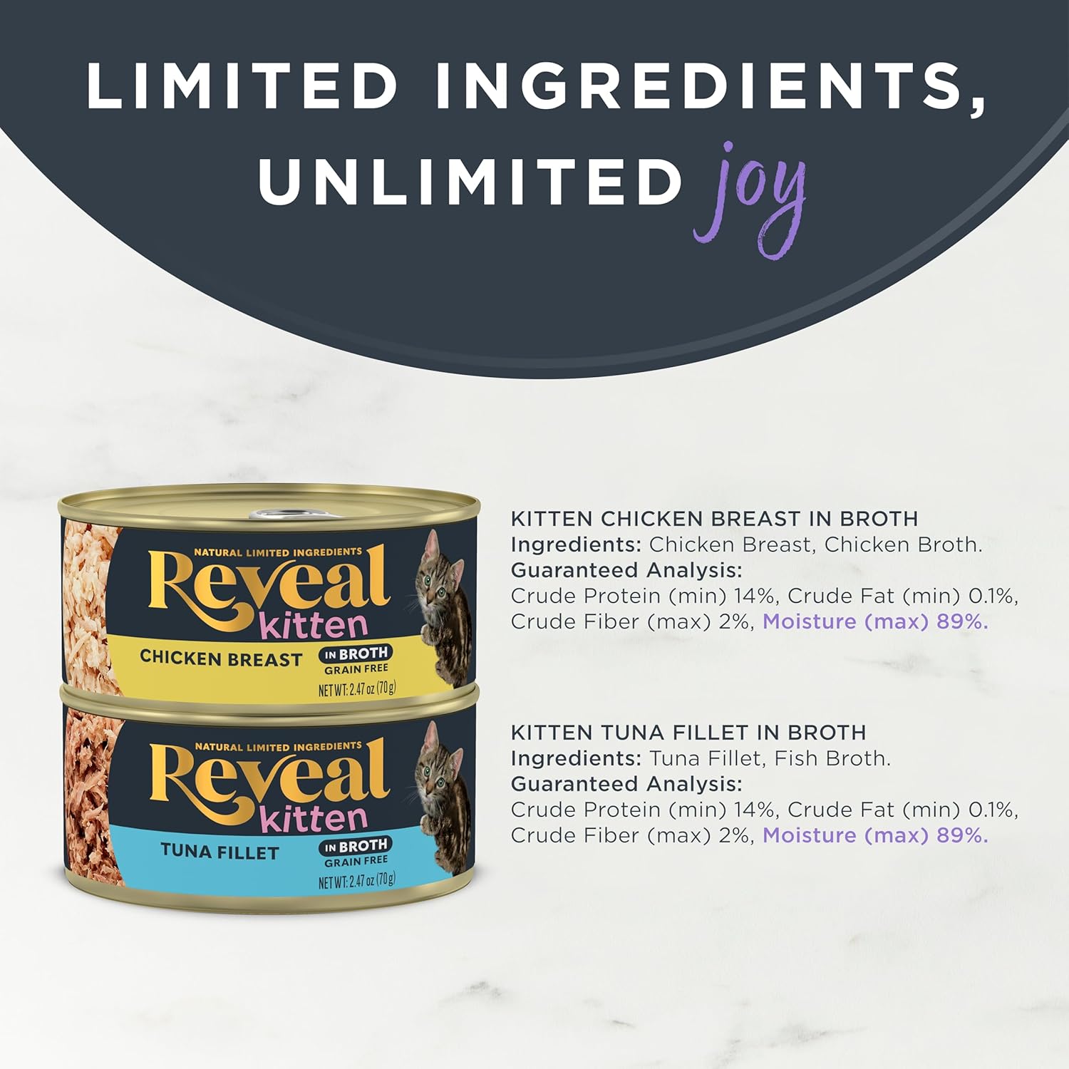We believe that better food starts with better ingredients. That’s why our natural formulas are free from artificial preservatives, colors, and flavors. You won’t find any unnecessary additives here—just the honest, simple taste of real fish and poultry in a hydrating, savory broth. The high moisture content not only makes every meal delicious but also helps keep your kitten or cat hydrated throughout the day.