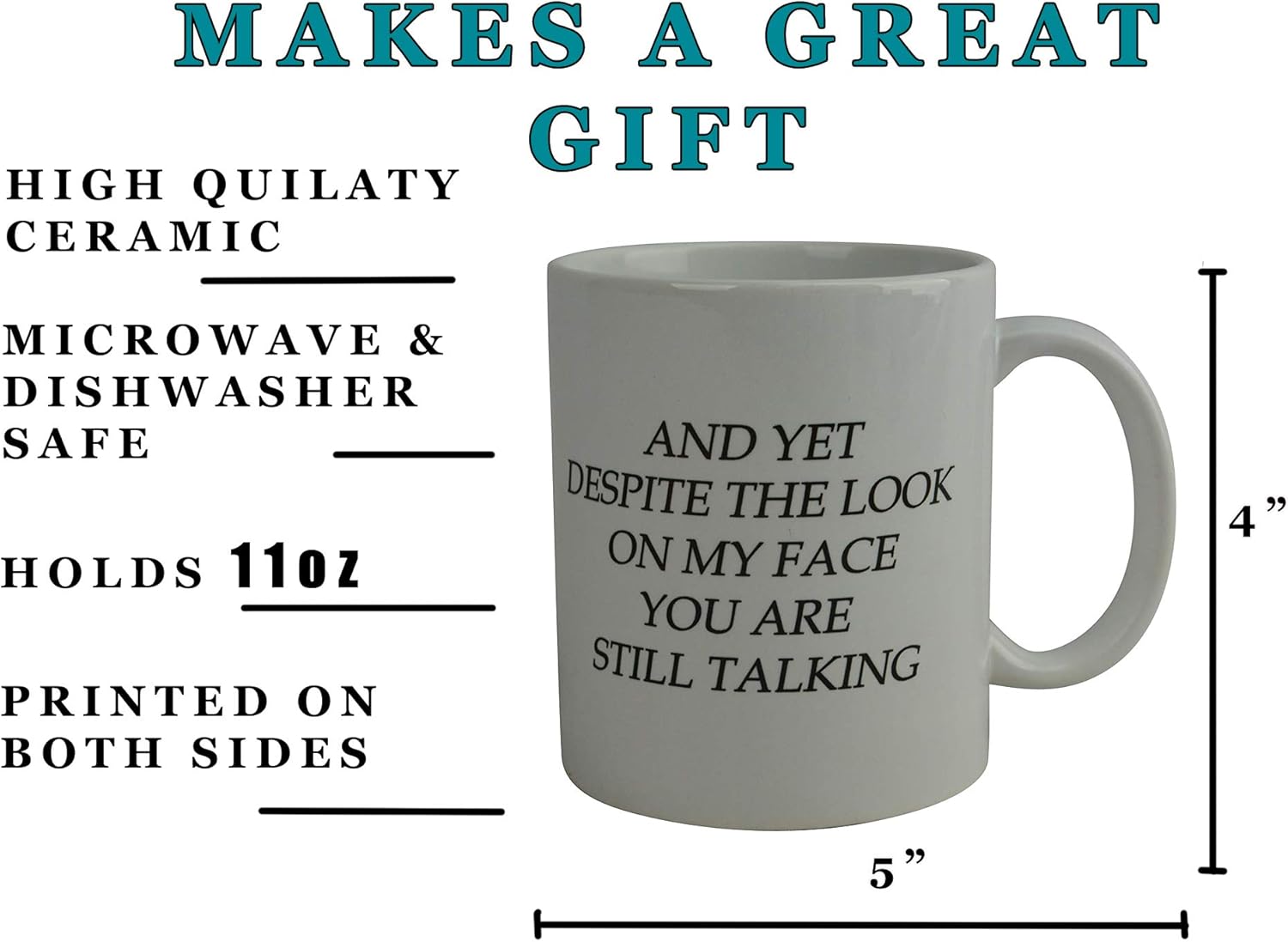 - SARCASTIC STATEMENT: Features the hilarious phrase ‘And Yet Despite the Look on My Face You Are Still Talking’ in bold, easy-to-read text.