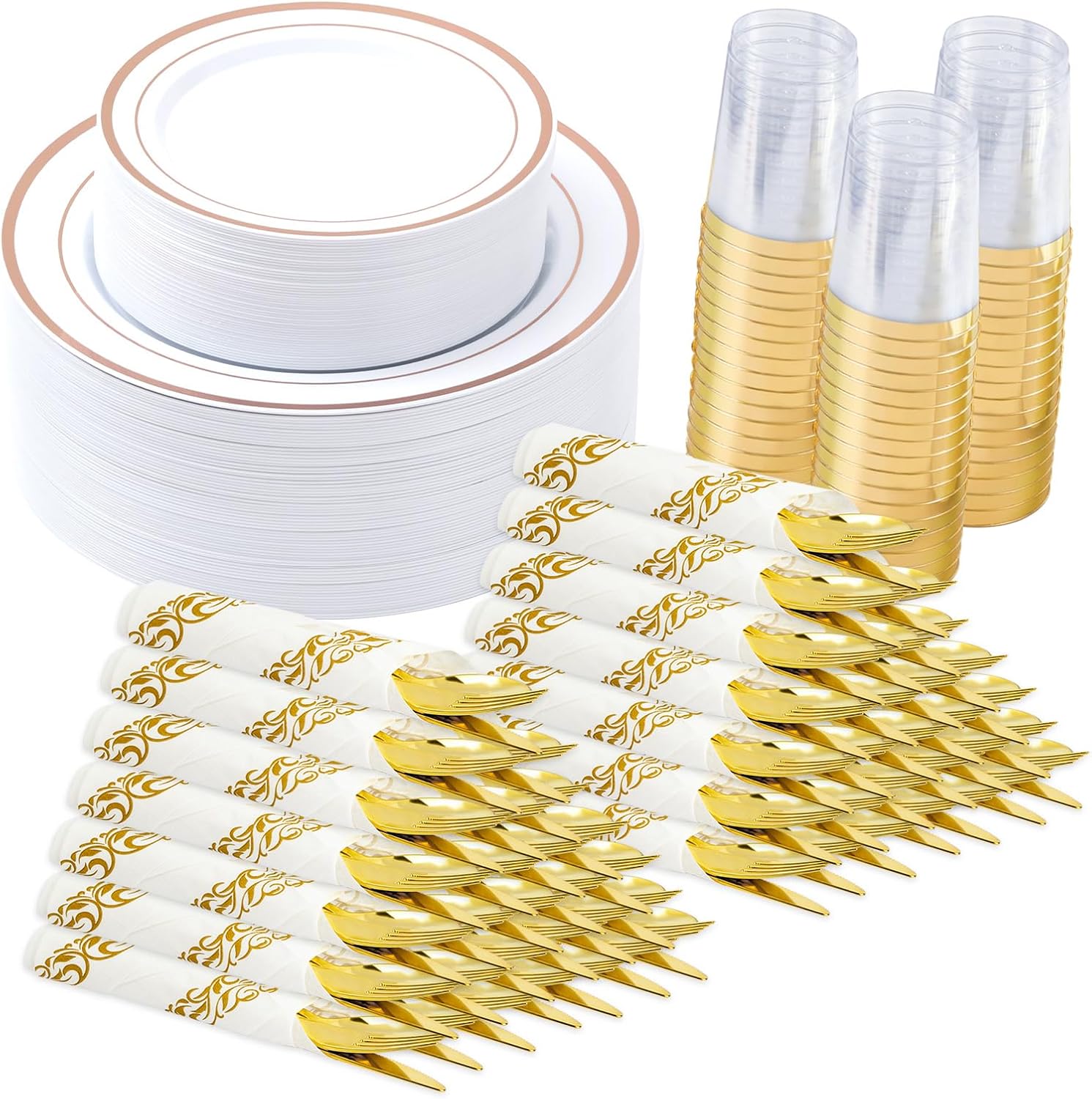Complete Service for 50 Guests: This all-inclusive bulk pack contains everything needed for a full table setting. You will receive 50 large 10.25-inch dinner plates, 50 7.5-inch salad/dessert plates, 50 sturdy 9oz cups, 50 heavyweight plastic forks, 50 knives, 50 spoons, and 50 matching 2-ply paper napkins. Whether you are hosting a wedding reception, Thanksgiving dinner, or a New Year’s Eve bash, we have you covered.